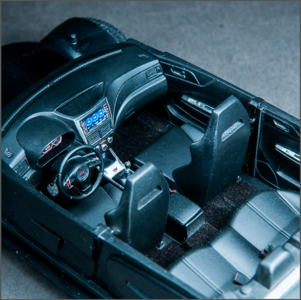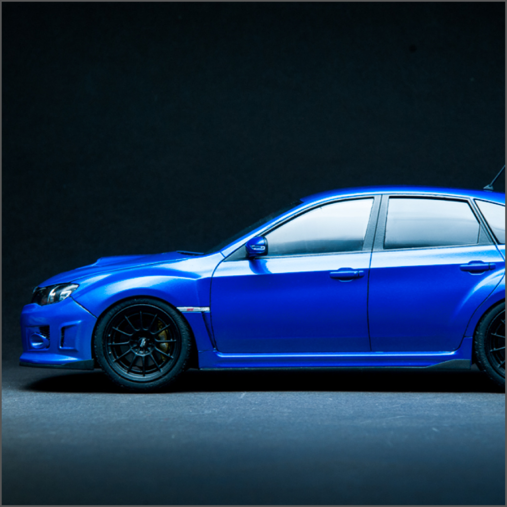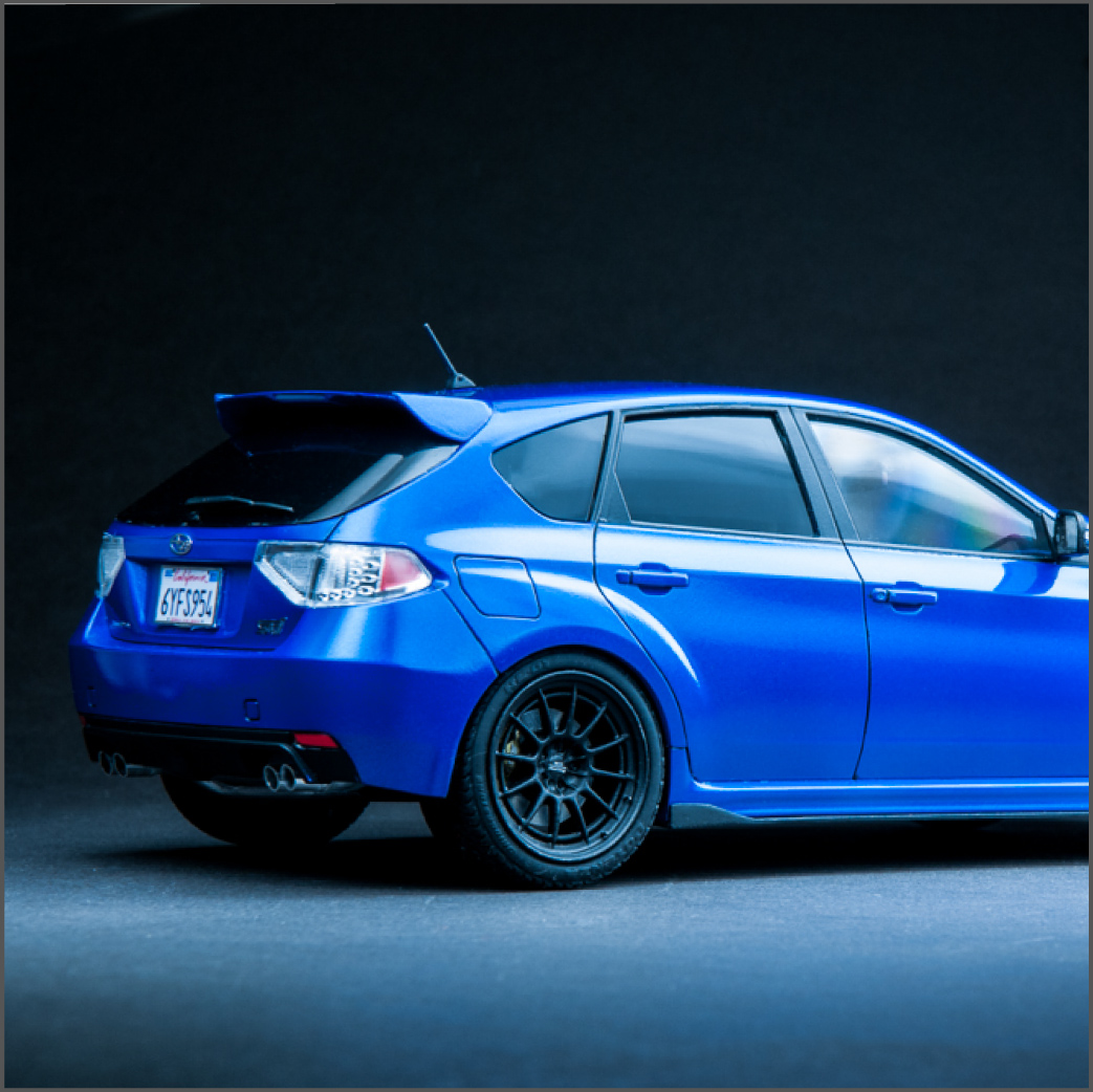 I knew this guy a while back that was into JDM cars. In fact, it was he that got me hooked on them. He's the one that told me about the WRX/STi, as well as its rival, the Evo. After that, my interest in Japanese sports cars seemed to lean in that direction. I've been into turbo cars for a while since owning my DSM, just something about that feel of boost, so when it was time for a new car, it was going to be a turbo, no doubt about it. I also wanted all-wheel-drive because I like to snowboard in the winter, plus lack of grip sucks, so I ended up with a 2013 WRX hatchback. Naturally, I wanted to build a model of it, but there is no "regular" WRX kit, so I got this STi kit, which essentially looks identical to my car, so it worked out well. I added some aftermarket Enkei NT-03M wheels and a photoetch detail set. Paint is from the Subaru dealer and here is the result.