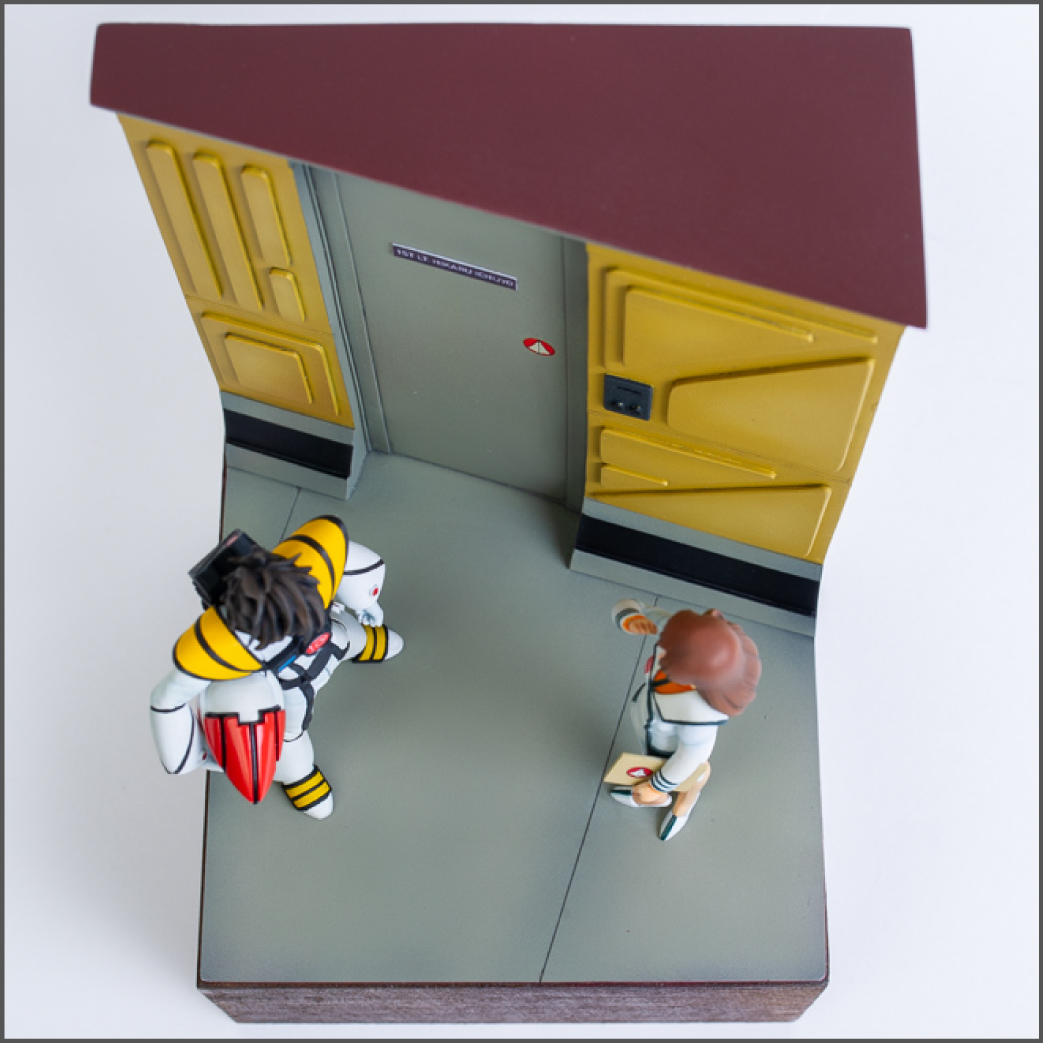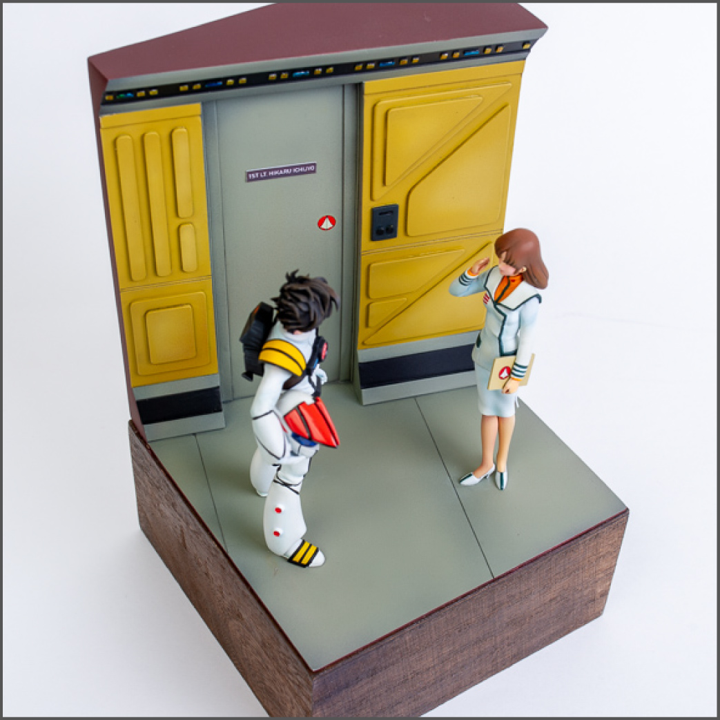 For the base, I'd already decided I wanted it to be a scene inside the SDF-1 space fortress, so I took a bunch of reference screenshots from the movie and built a few cardboard mockups until I got something I liked. What you see is the final product. The base is 100% scratch built from styrene.