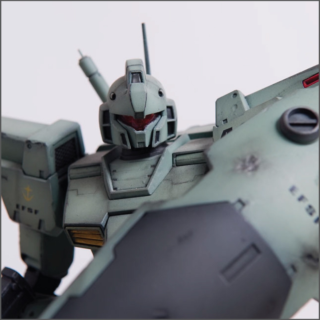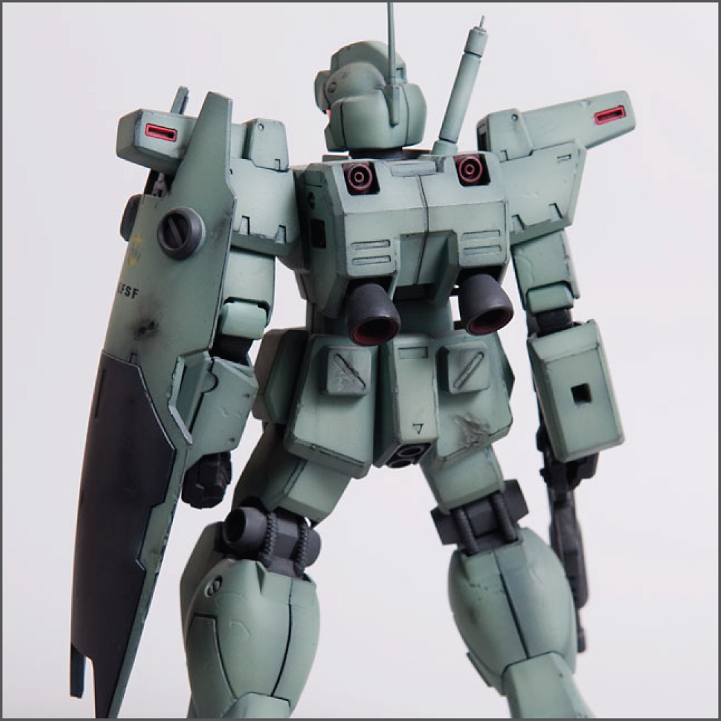 I added a few detail bits to this kit, such as some mesh screens in the shoulders, some back detail on the shield. I also cut the gun apart and redesigned it, as well as the feet since I didn’t like the stock kit’s feet. Painted in anime colors to finish it off.