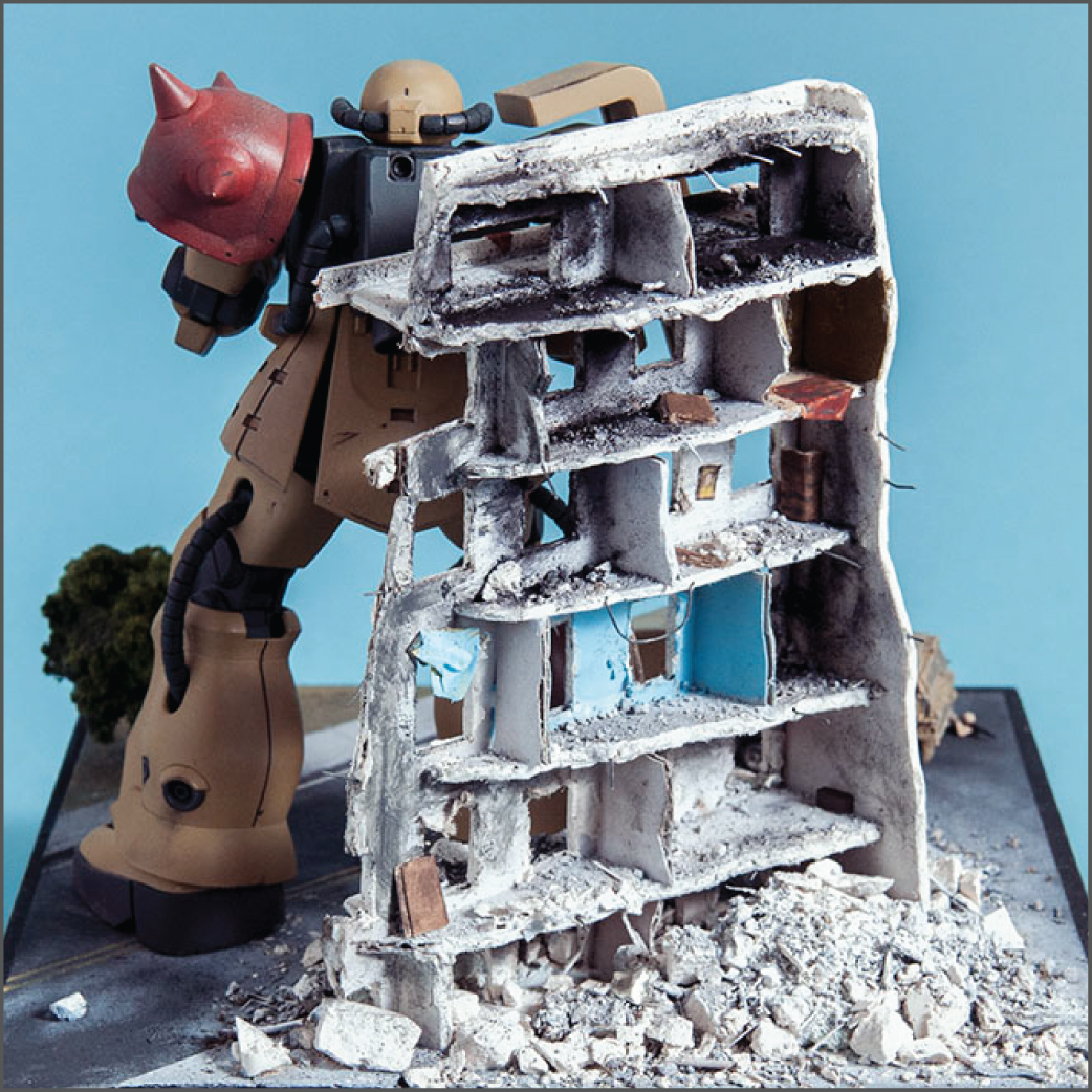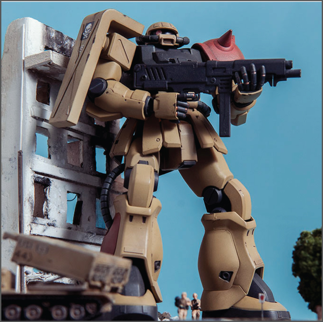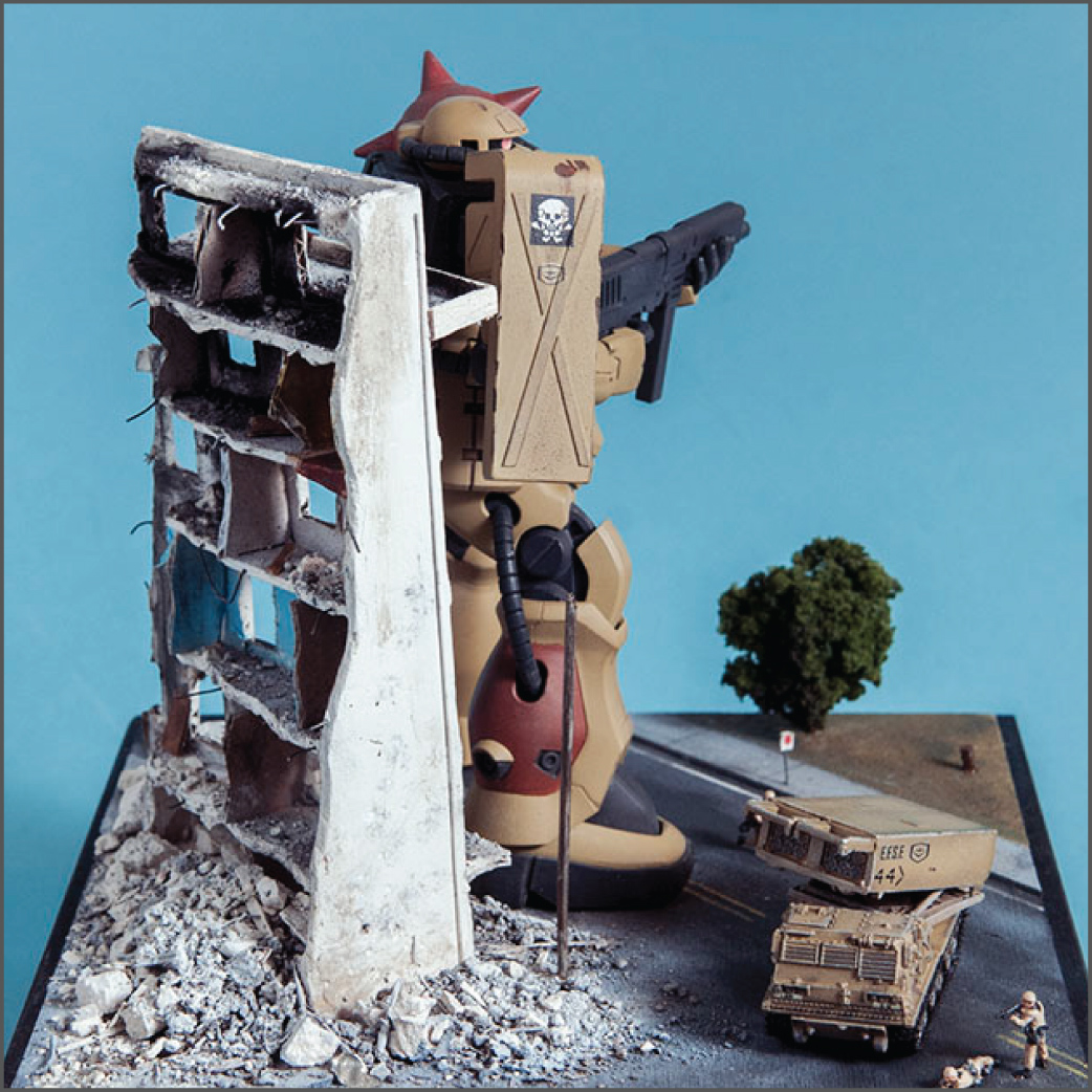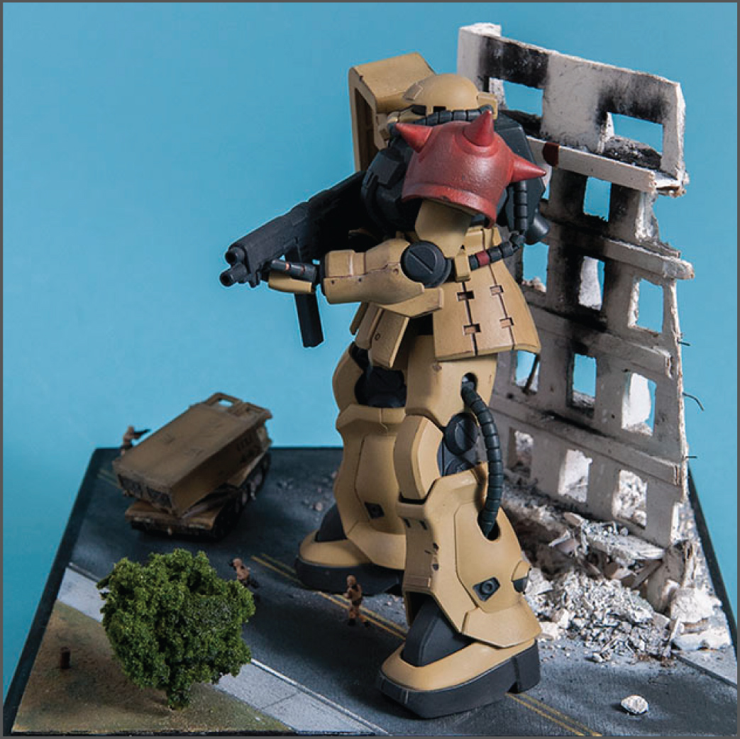 The Zaku F2 has always been my favorite Zaku design. I like the 'chunkiness' of it or something. Maybe it's because 0083 was the first Gundam series I ever saw and it's nostalgia.. dunno. Anyway, this HGUC version is a nice little kit. It's your typical HGUC, but it's a little more modern so it has good details and form. I decided to make a little diorama out of it since it's a small-ish size. I scratch built the building, adding rubble from crushed plaster and dirt from the back patio. The armor is pre-built from Dragon models. It just happens to be 1/144 scale too, so bonus. The figures are from Pegasus models and are also pre-built. In the anime, the Earth Federation is using some stolen Zakus for themselves, so I painted those last two, as well as the Zaku, to fit the Earth Federation forces.