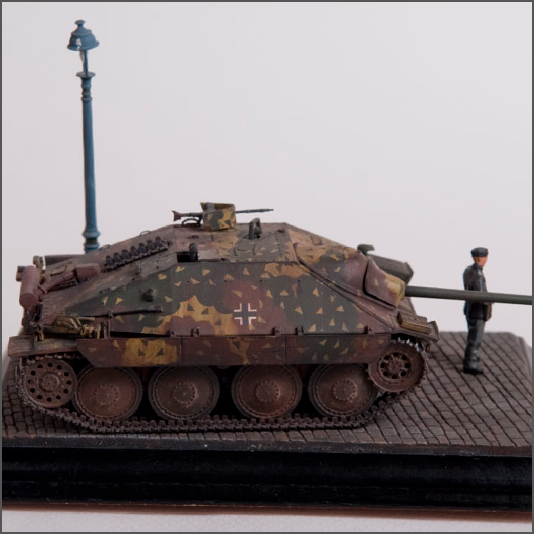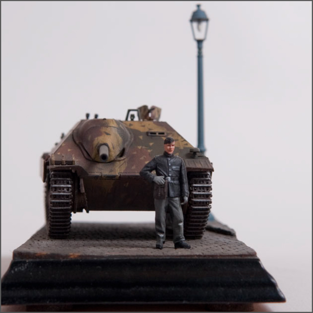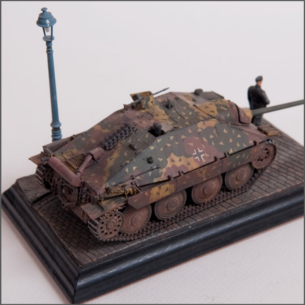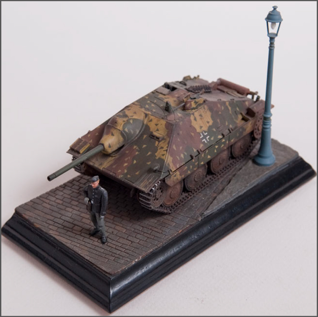 Built straight from the box with only a little photoetch mesh added to the grill. The figure is from a separate Tamiya set as well as the lamp post. The cobblestones are made from plaster.