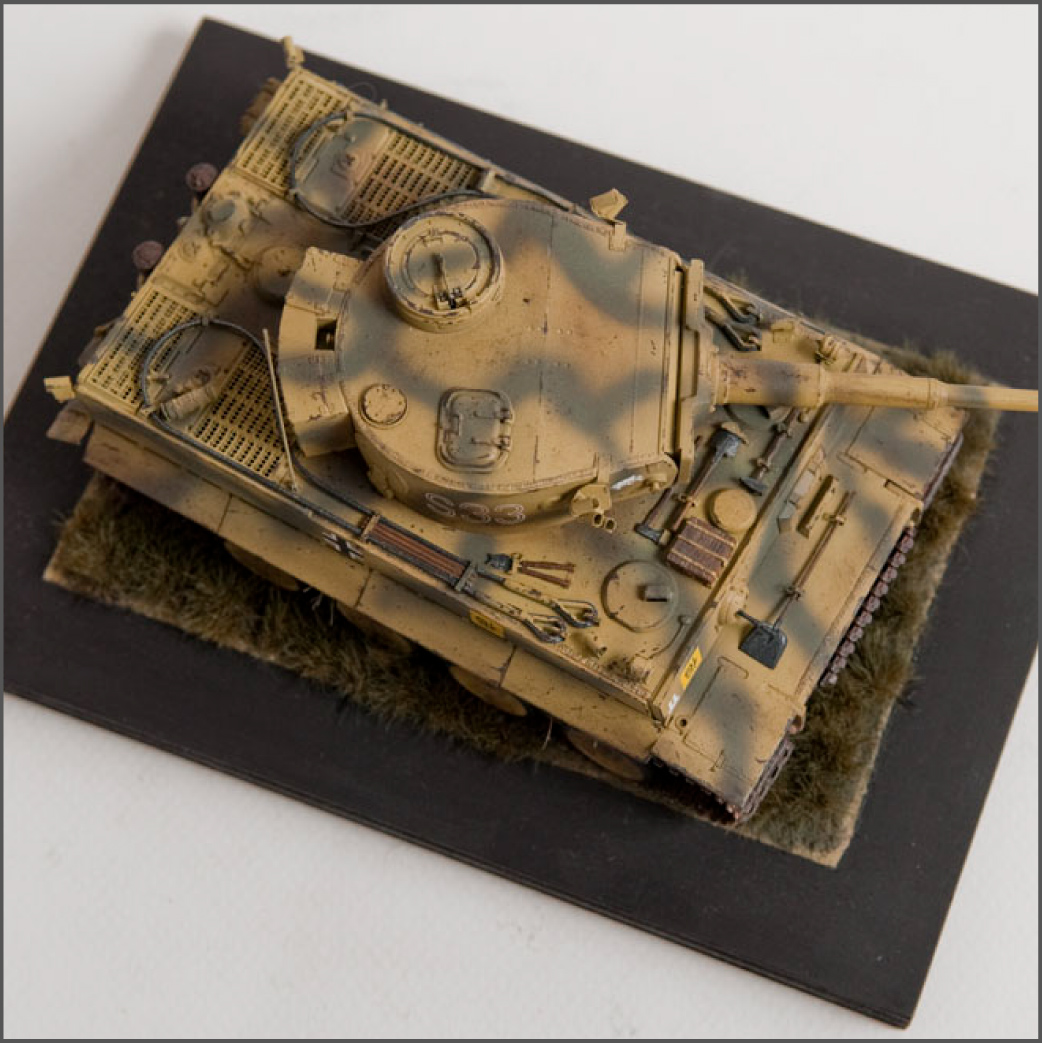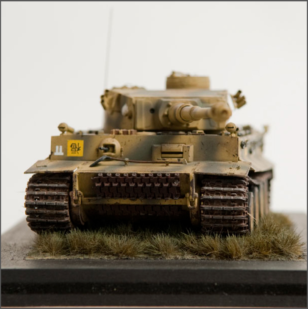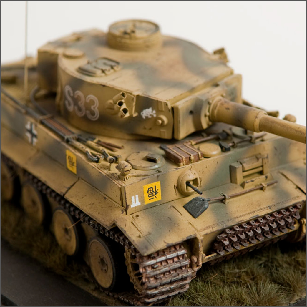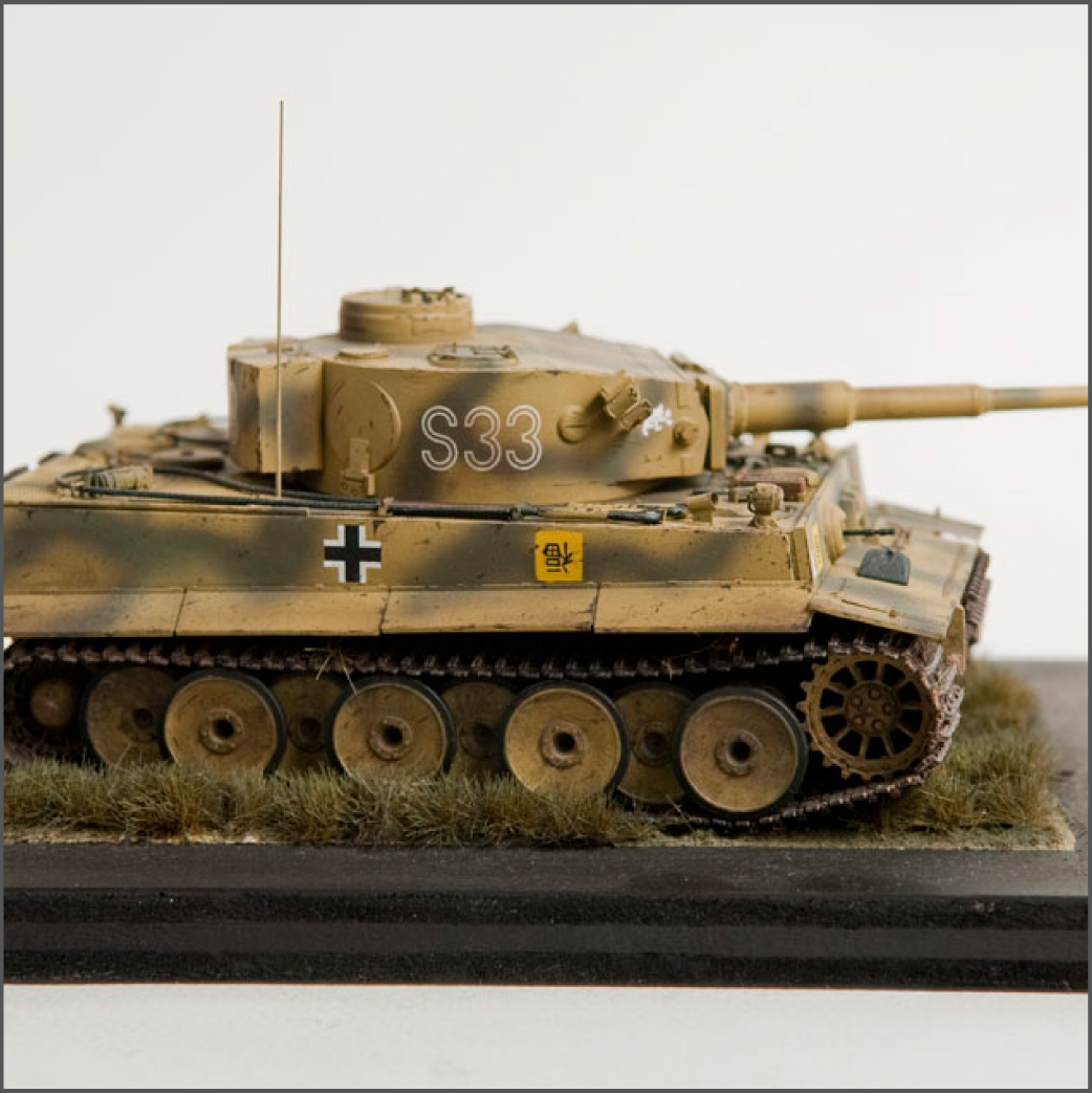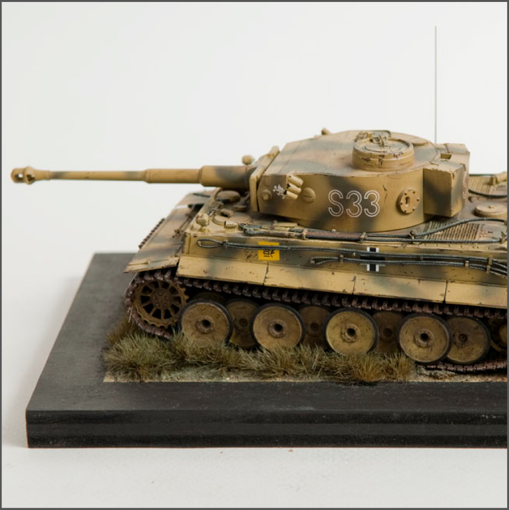 The S33 Tiger is a pretty popular subject. Probably because it's used for the box art, with decals, of many a Tamiya Tiger kit. This one's built with full photoetch details from Eduard. A metal barrel and resin tracks to give them that proper sag. The grass on the base is from "The Army Painter". It's good stuff..