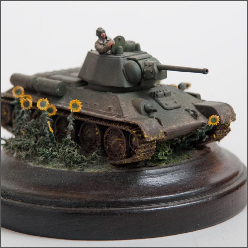 I built this after reading the book, Last Citadel, which more or less is about some tankers during the battle of Kursk in Russia during WWII. Part of the book describes a battle taking place in a field of sunflowers. This is a tiny 1/72 kit, built oob. The sunflowers are wire and cut paper.