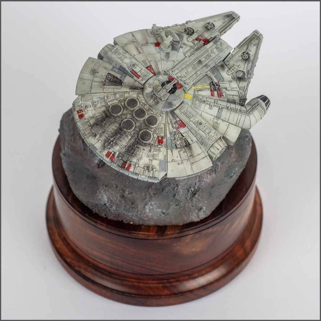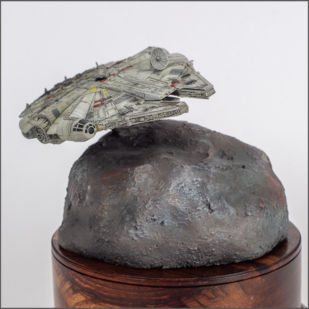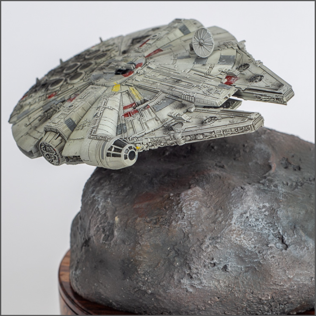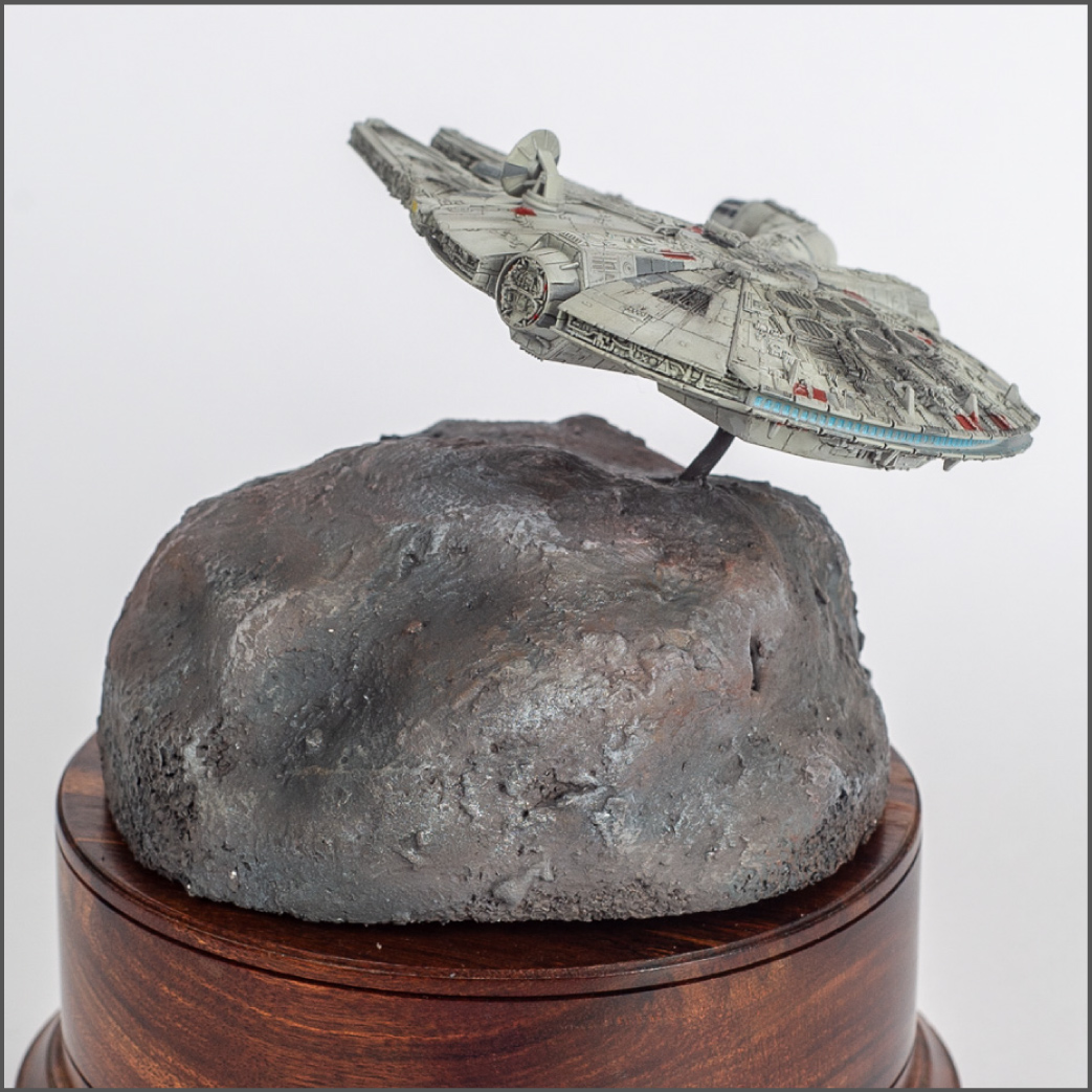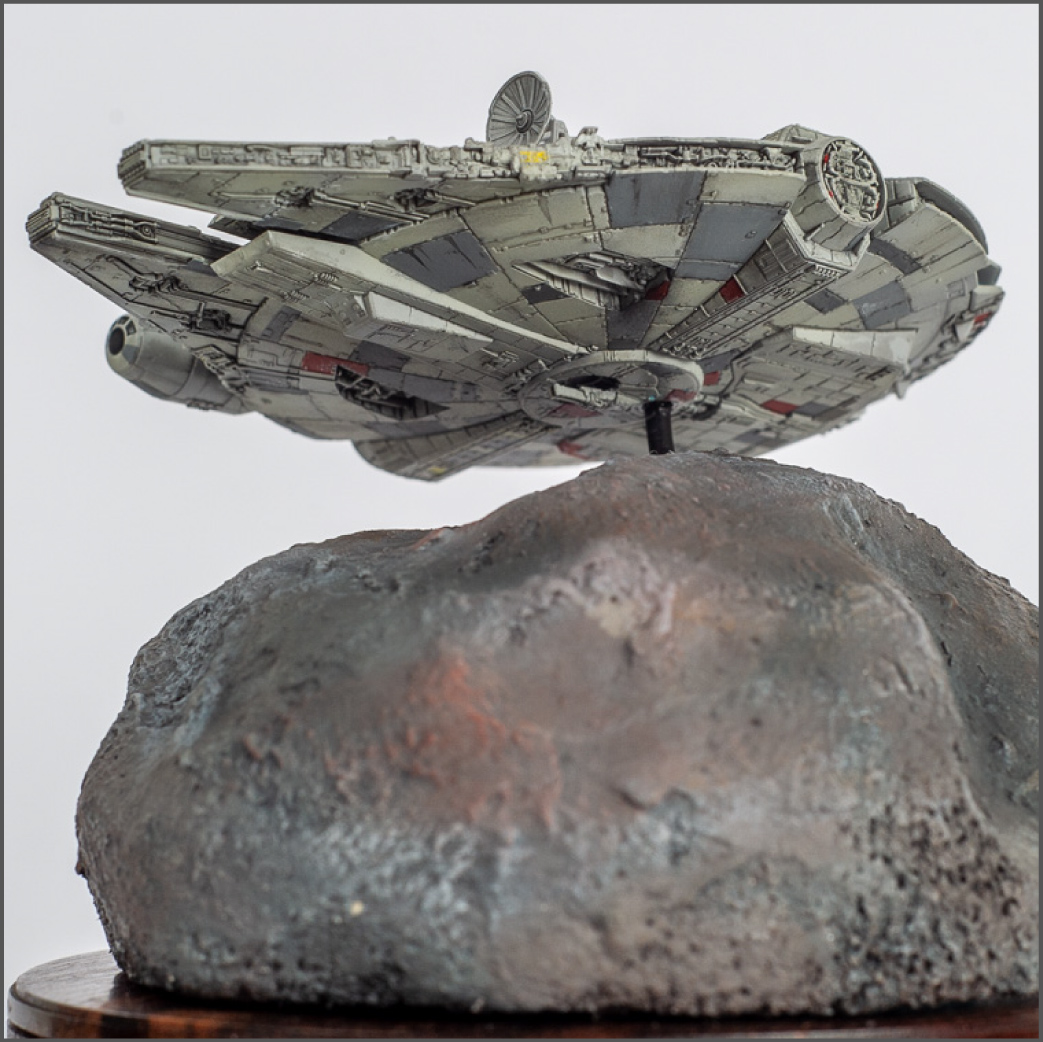 Assembly was simple, just a few pieces. It comes with some stickers for the windows and different colored panels that are thrown in the trash. Its the paintjob that makes this kit shine. Aside from thebase color, all done by hand brushing. The asteroid base was made with some styrofoam. Pretty simple, but effective. These little kits are small, but fun quick builds. |