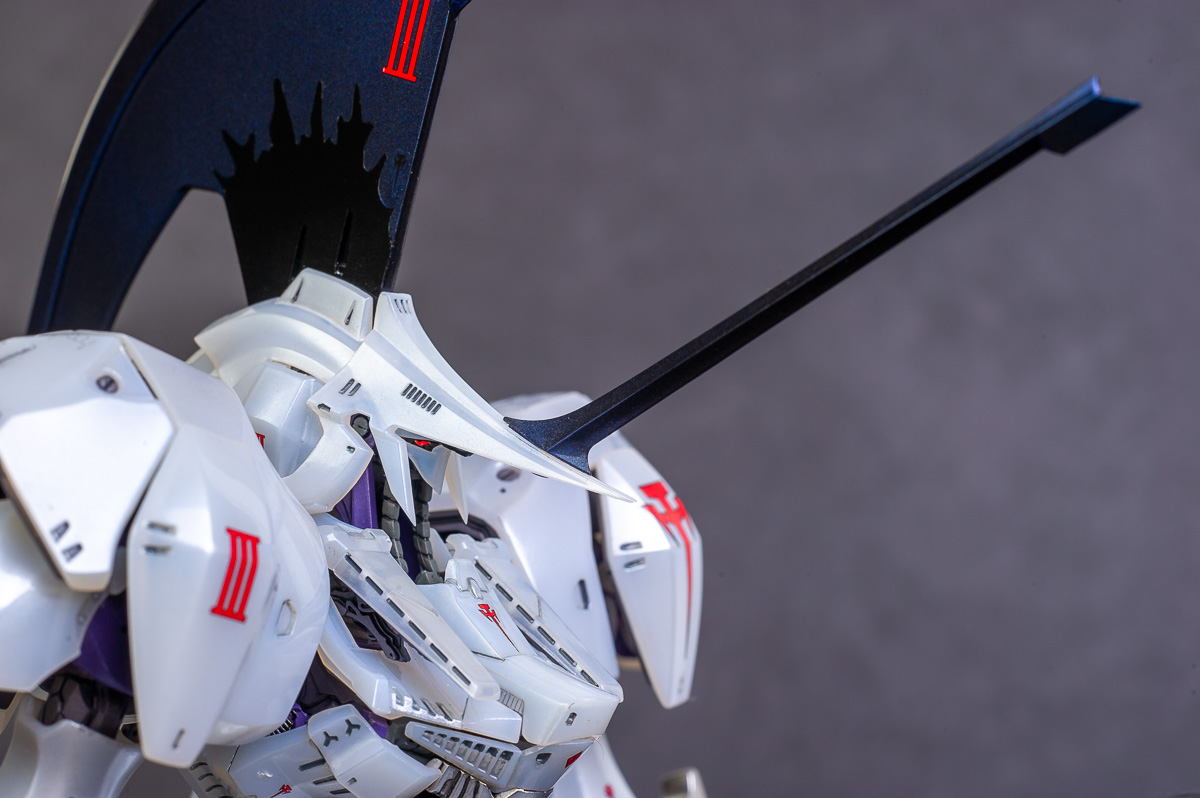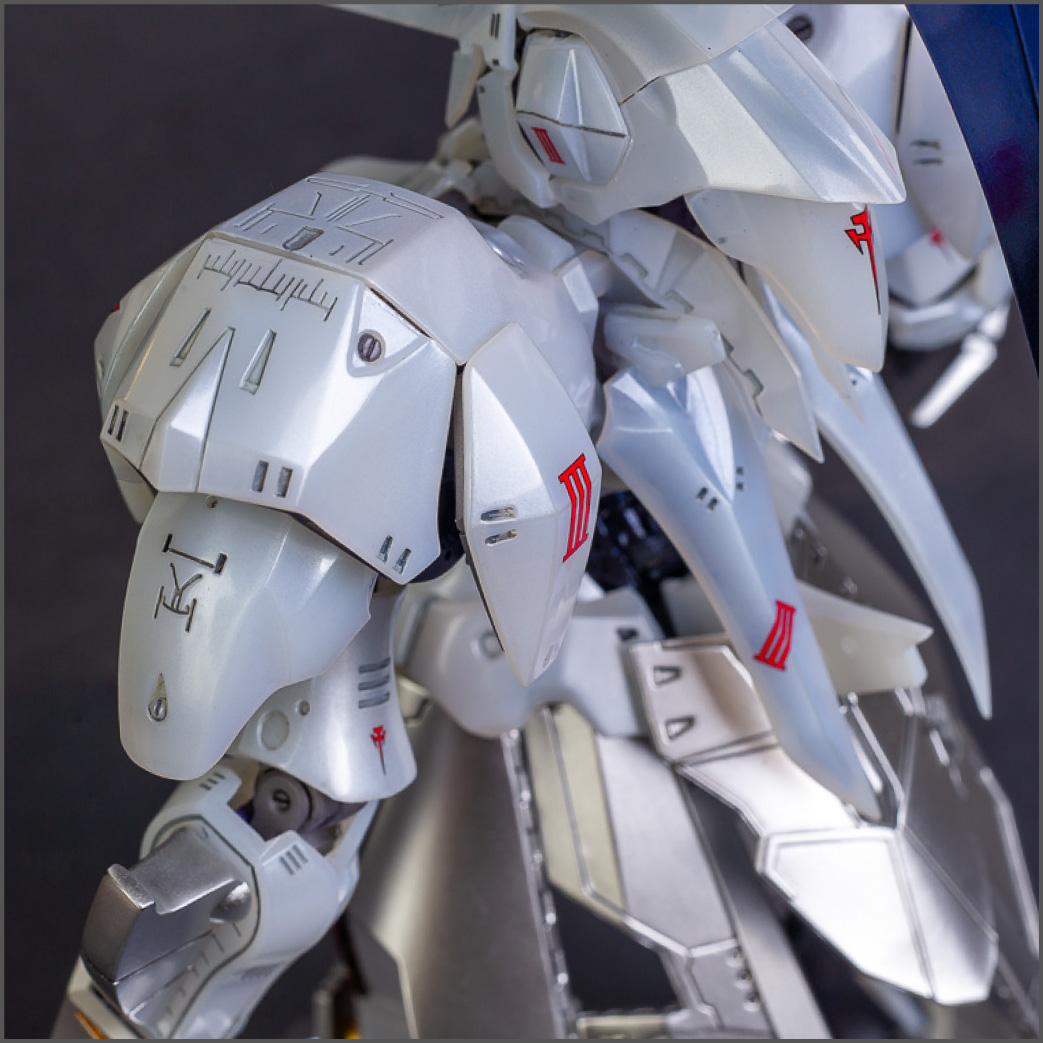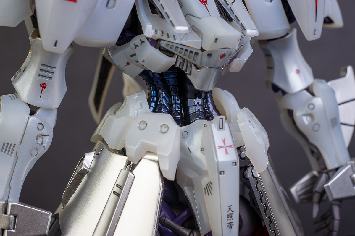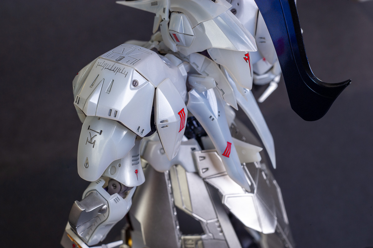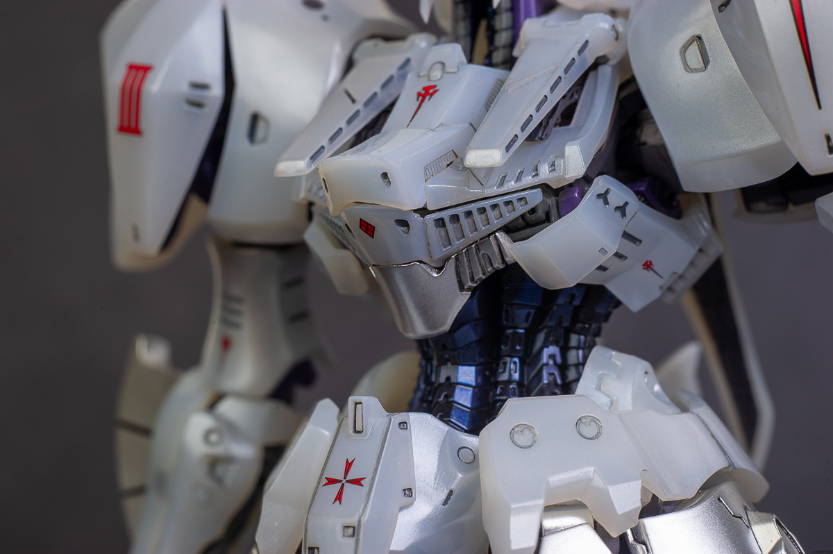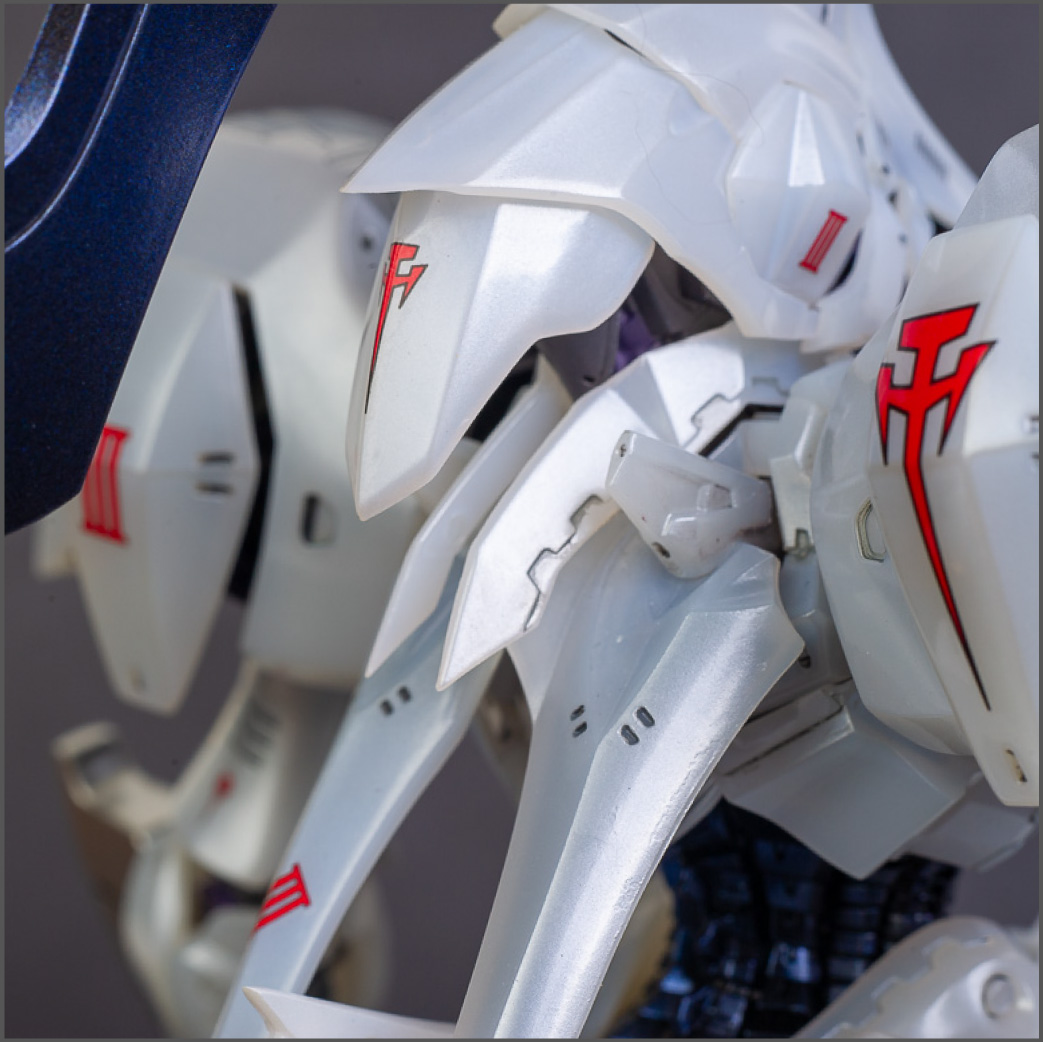 The main painting was as follows: White armor: Mr Color Lascivus Clear White, with Mr Crystal Color Moonstone Pearl on top. Blue/Black waist and "mohawk": Gloss black with Mr Crystal Color Sapphire Blue over it. The frame is just straight up Mr Color Purple and the grey is a mix of some stuff.. it's in the manual, but I forgot what it was. Silver: Tamiya lacquer Sparkling Silver Gold: Gaianotes Star Bright Gold and... some detail bits with Vallejo I took pics of the frame too, so check them out. They're permanently covered with the armor now, so stuff like the Fatima cockpit in the head are sealed forever, but at least I have the photos.
