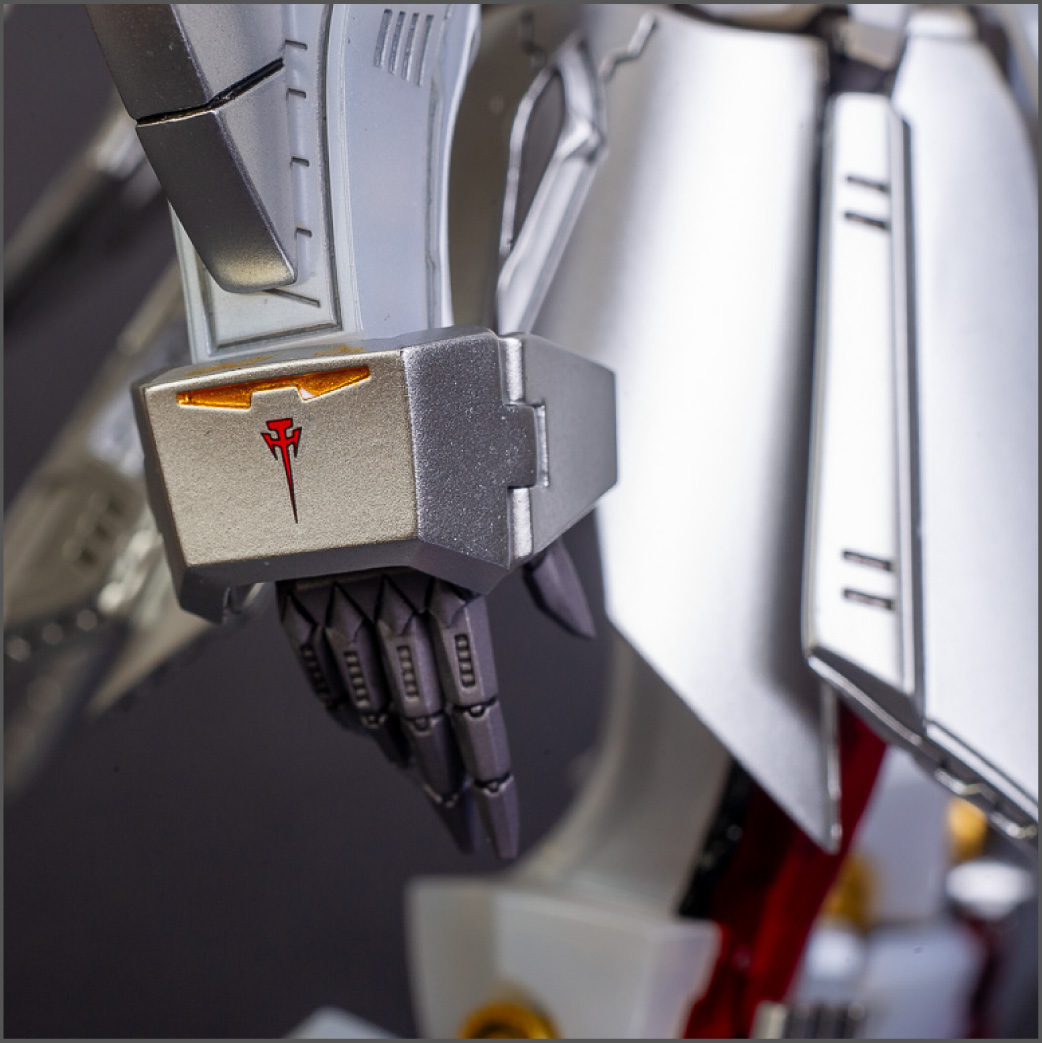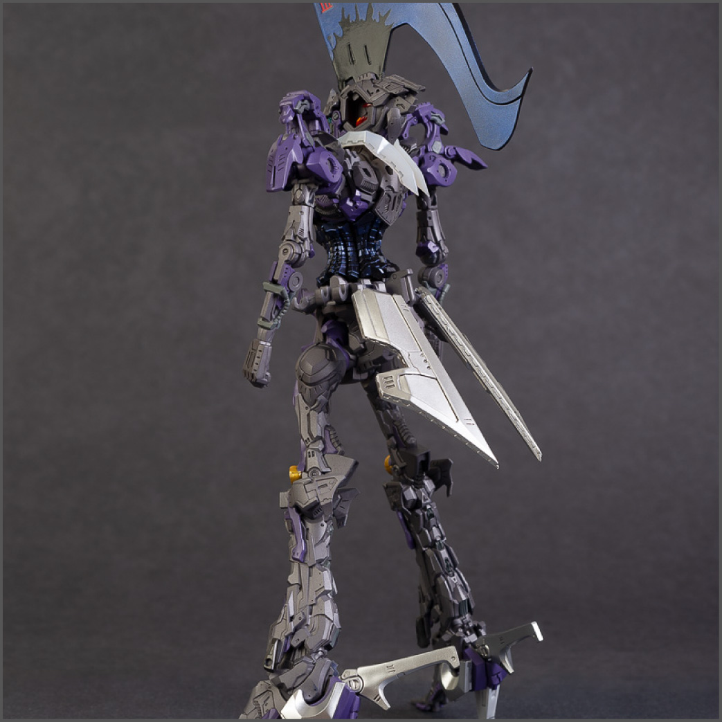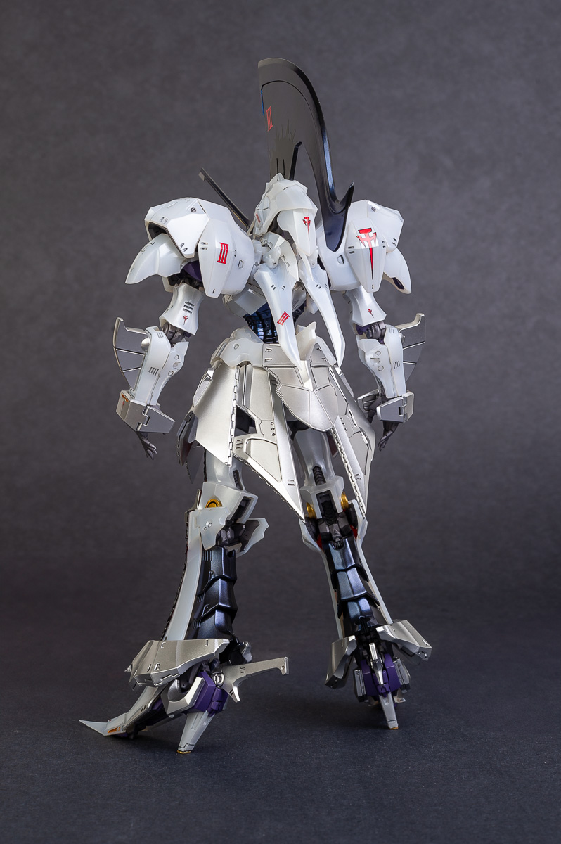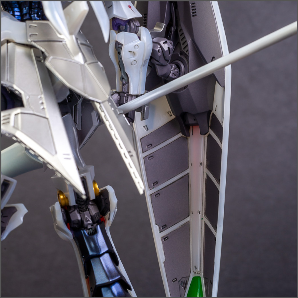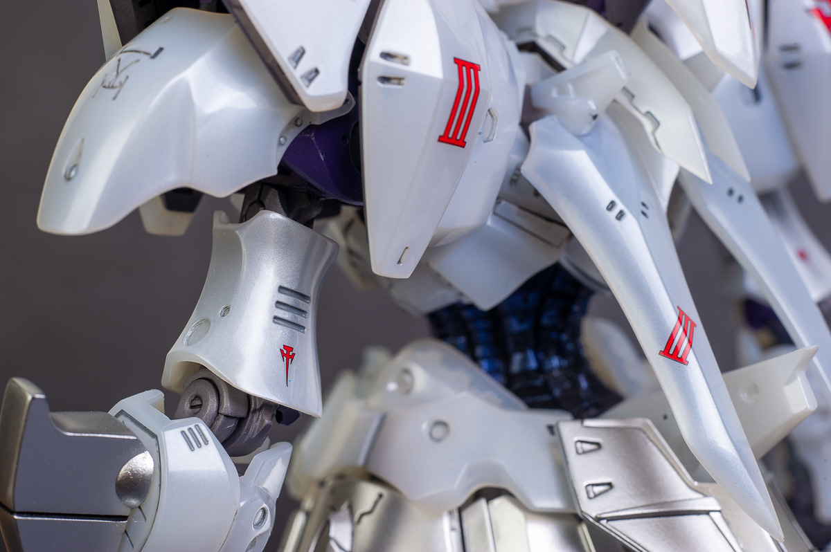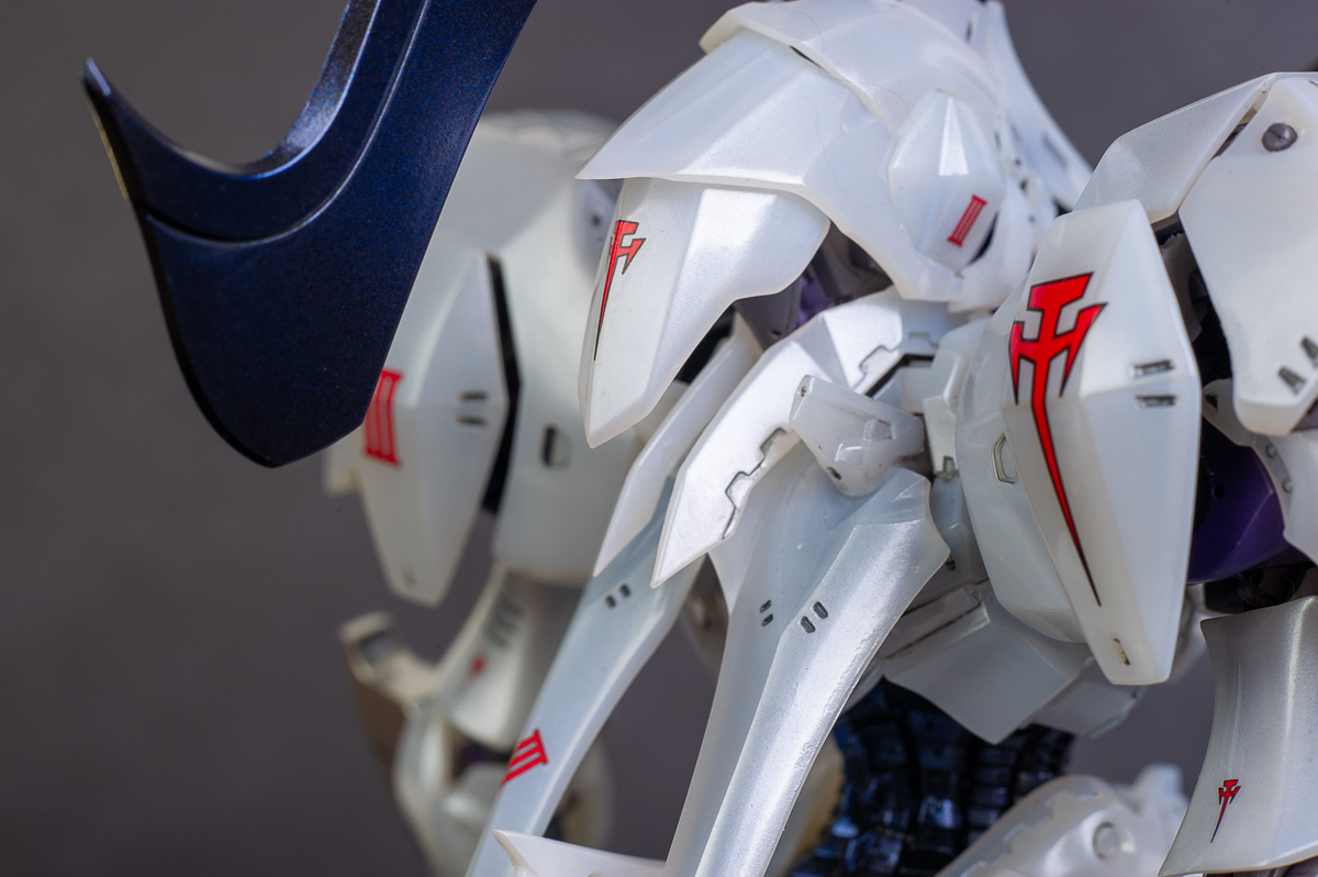 The main painting was as follows: White armor: Mr Color Lascivus Clear White, with Mr Crystal Color Moonstone Pearl on top. Blue/Black waist and "mohawk": Gloss black with Mr Crystal Color Sapphire Blue over it. The frame is just straight up Mr Color Purple and the grey is a mix of some stuff.. it's in the manual, but I forgot what it was. Silver: Tamiya lacquer Sparkling Silver Gold: Gaianotes Star Bright Gold and... some detail bits with Vallejo I took pics of the frame too, so check them out. They're permanently covered with the armor now, so stuff like the Fatima cockpit in the head are sealed forever, but at least I have the photos.