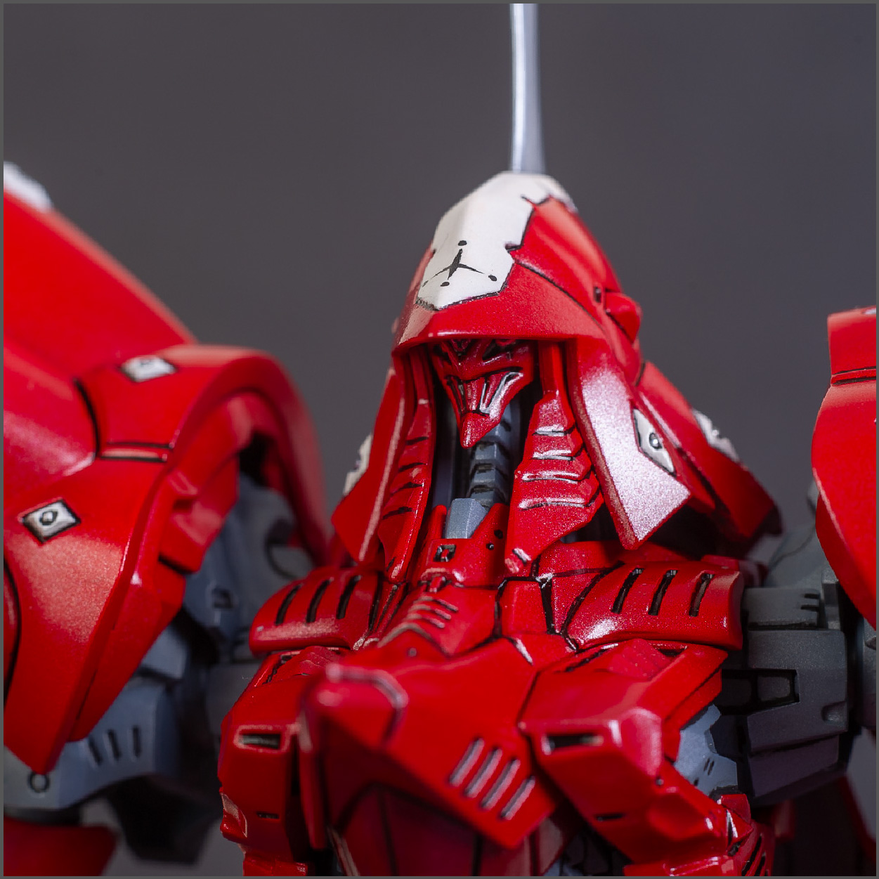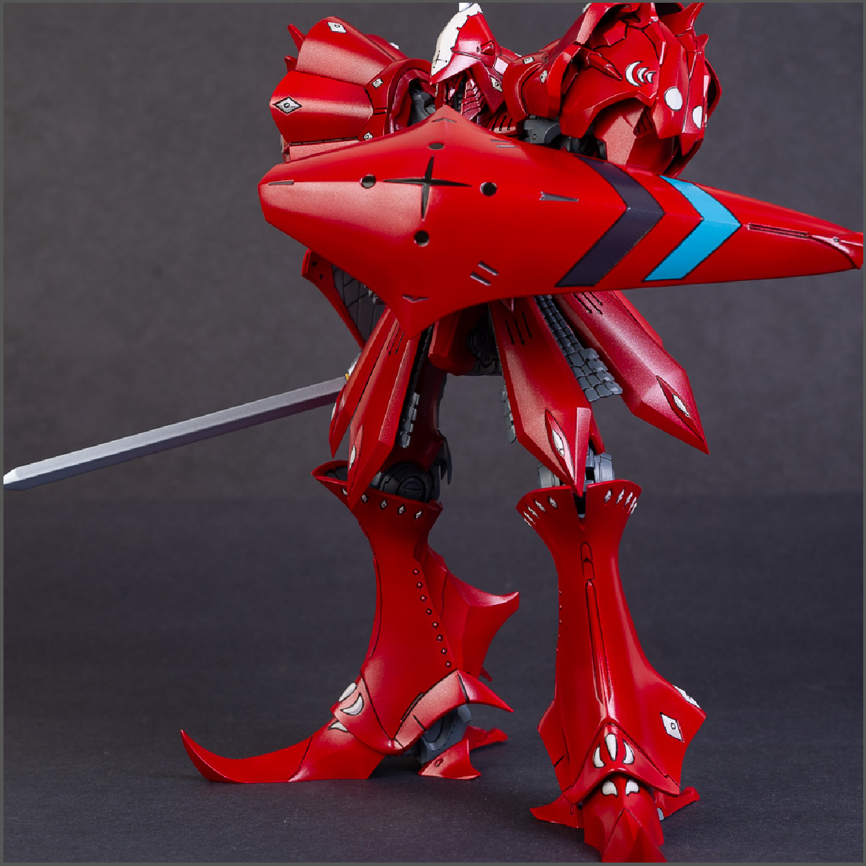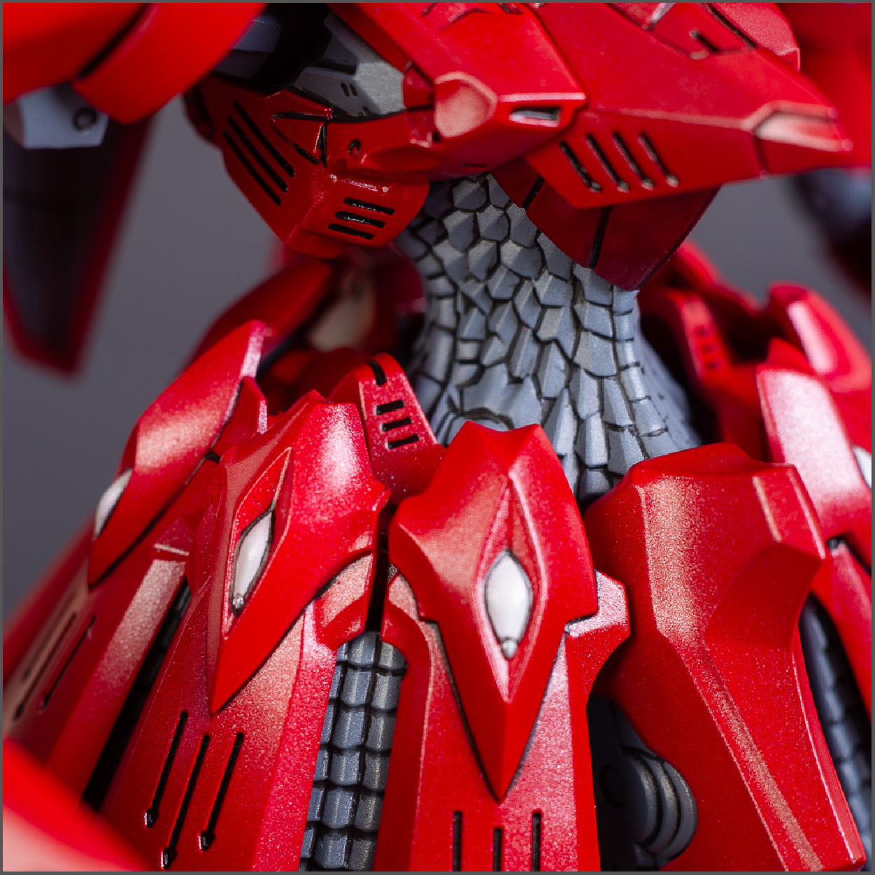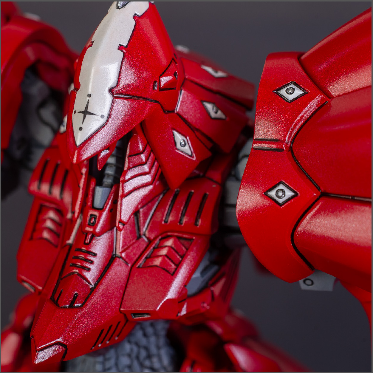 I've finished another Mortarheadd. This time the 1/100 IMS Sirene F kit released early 2025. It...looks...AWESOME! This red version is the Red Group leader of the Fillmore Empire's Kneu Syltiss Knights. Headdliner (pilot) = Brauma Ik Fatima (co-pilot) = Obriside I'm super happy with the end result, although I did have a little bit of user error trouble and had to repaint some of it a couple times. (dust and stuff). The build itself was pretty straightforward. It has screws in the joints that allows for better posing compared to past IMS kits so that's pretty cool. A few seamlines to fill, but not too bad. The red is a mix from the manual with a white pearl clear over it. I was a little skeptical of white pearl over red at first, but it add the beautiful color pop to the bulky design and it actually looks pretty badass. note: there's a pearl coat over it so for some reason it looks less glossy than it actually is :(