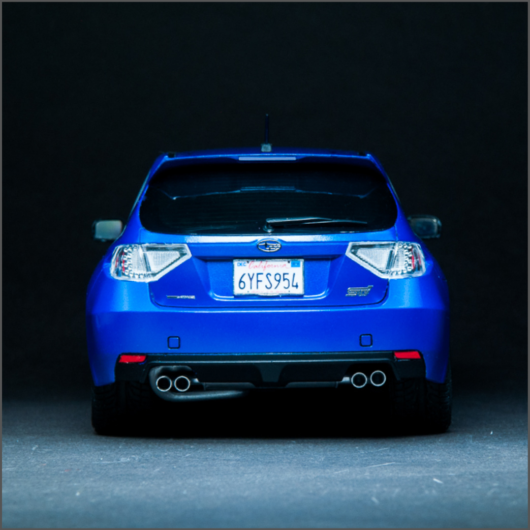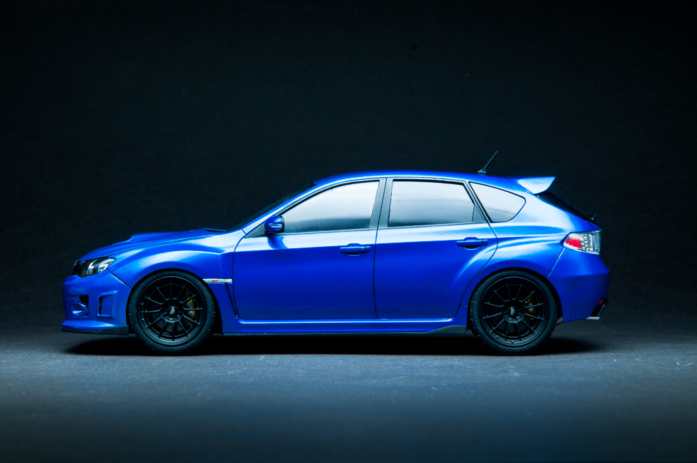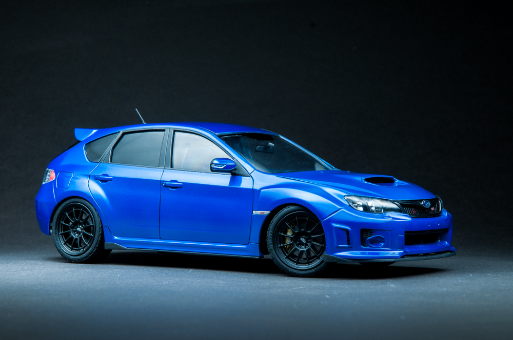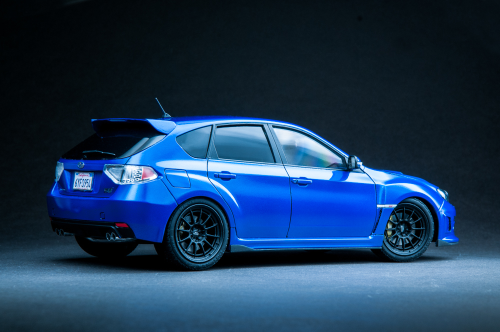I knew this guy a while back that was into JDM cars. In fact, it was he that got me hooked on them. He's the one that told me about the WRX/STi, as well as its rival, the Evo. After that, my interest in Japanese sports cars seemed to lean in that direction. I've been into turbo cars for a while since owning my DSM, just something about that feel of boost, so when it was time for a new car, it was going to be a turbo, no doubt about it. I also wanted all-wheel-drive because I like to snowboard in the winter, plus lack of grip sucks, so I ended up with a 2013 WRX hatchback. Naturally, I wanted to build a model of it, but there is no "regular" WRX kit, so I got this STi kit, which essentially looks identical to my car, so it worked out well. I added some aftermarket Enkei NT-03M wheels and a photoetch detail set. Paint is from the Subaru dealer and here is the result.