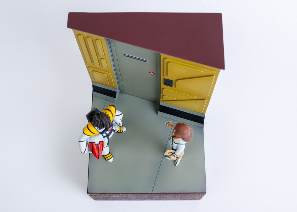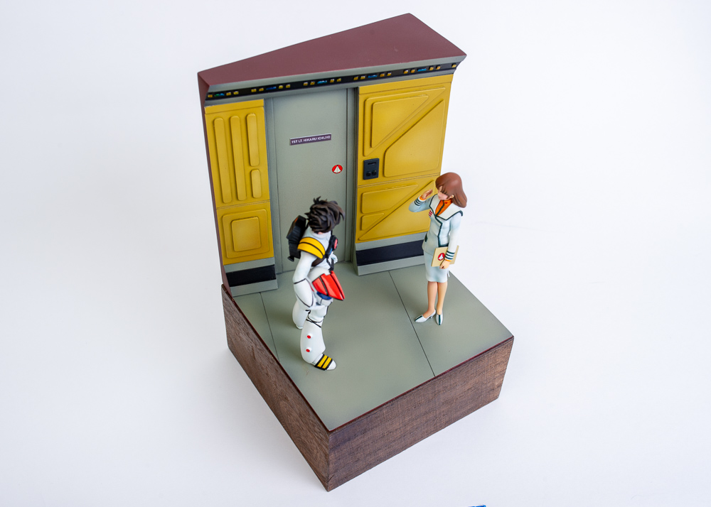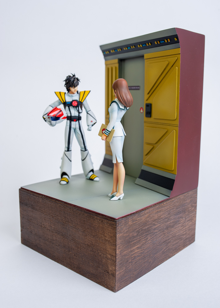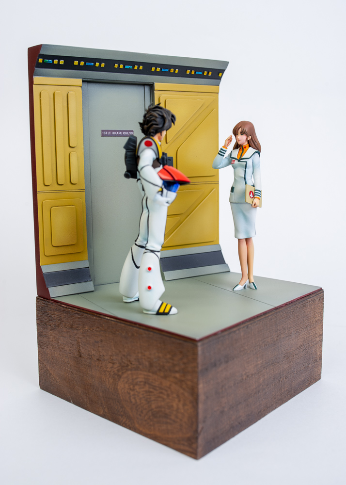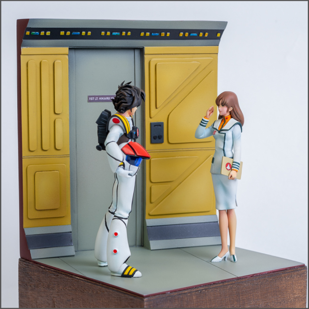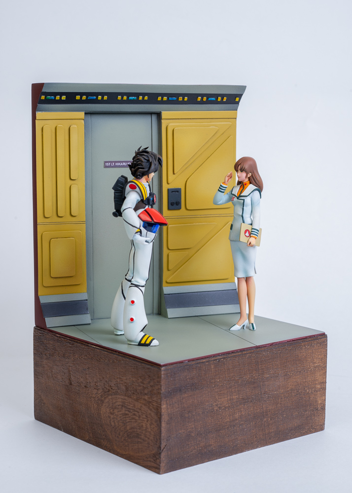 For the base, I'd already decided I wanted it to be a scene inside the SDF-1 space fortress, so I took a bunch of reference screenshots from the movie and built a few cardboard mockups until I got something I liked. What you see is the final product. The base is 100% scratch built from styrene.