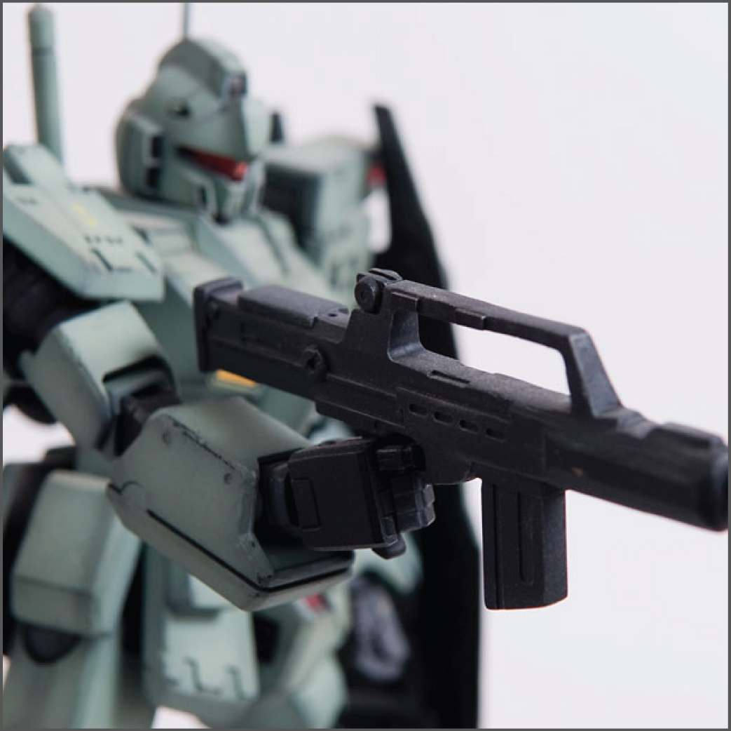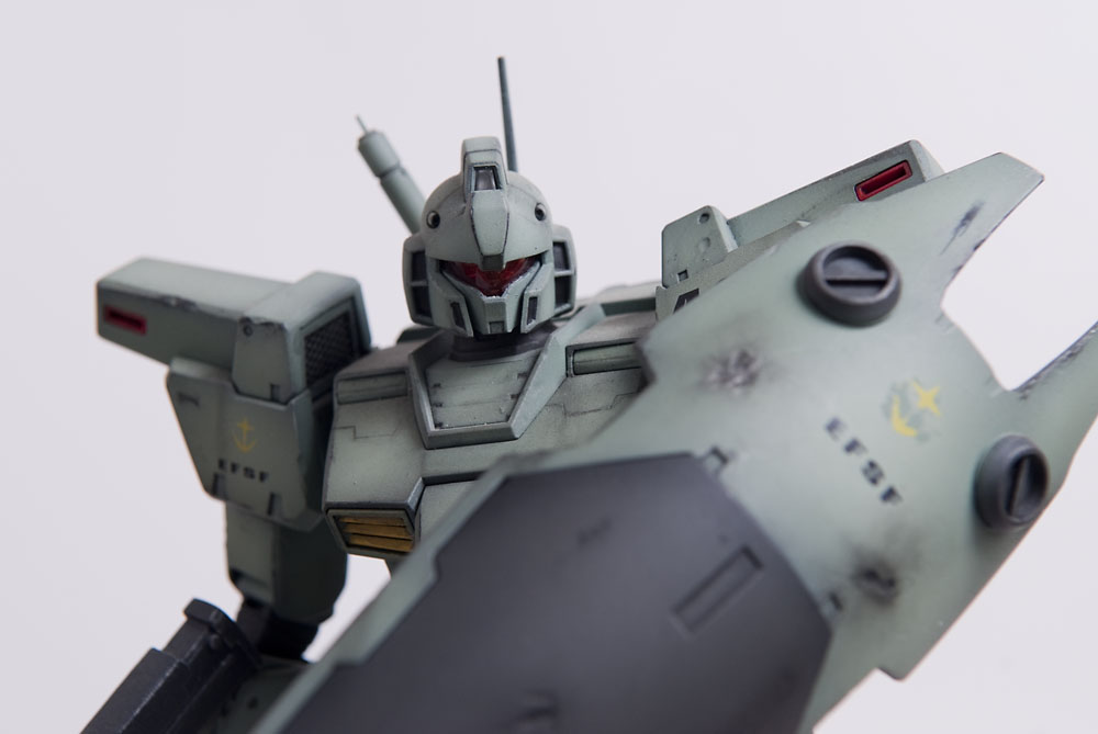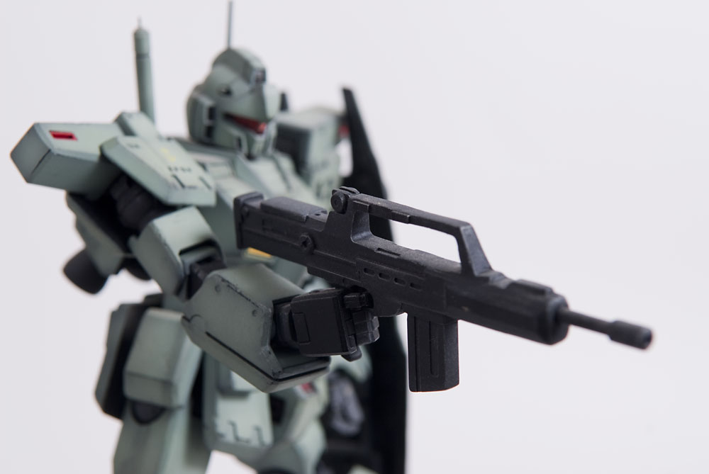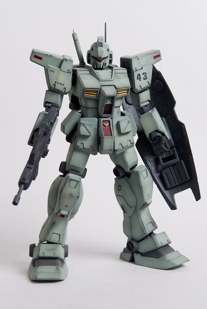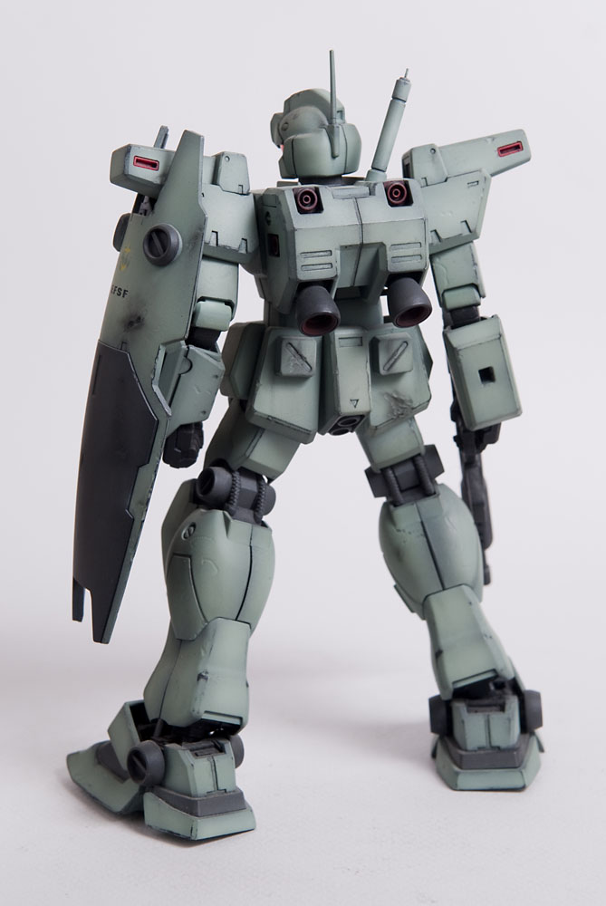 I added a few detail bits to this kit, such as some mesh screens in the shoulders, some back detail on the shield. I also cut the gun apart and redesigned it, as well as the feet since I didn’t like the stock kit’s feet. Painted in anime colors to finish it off.