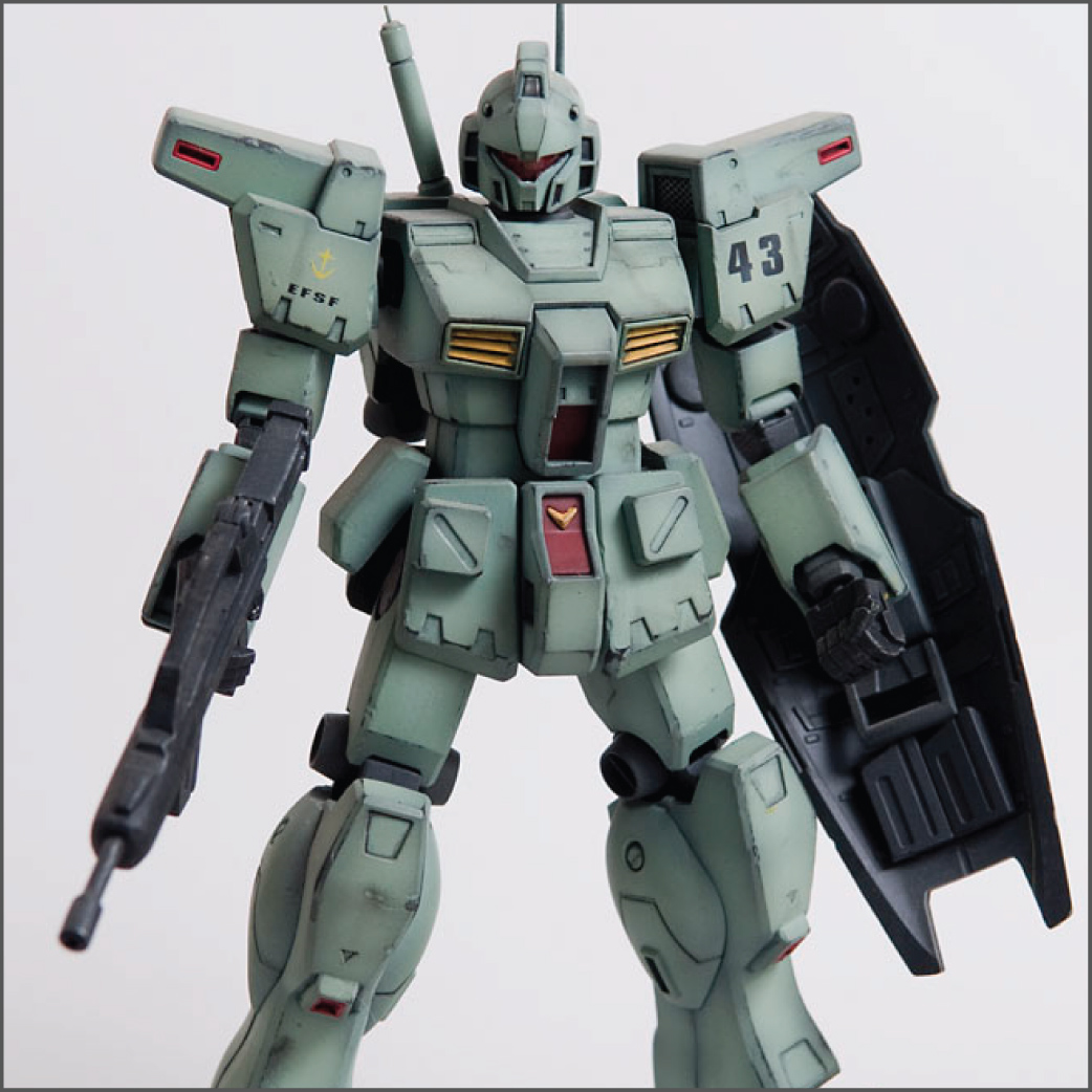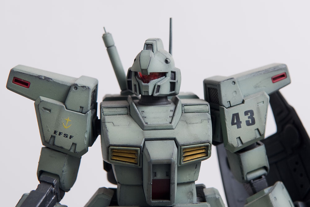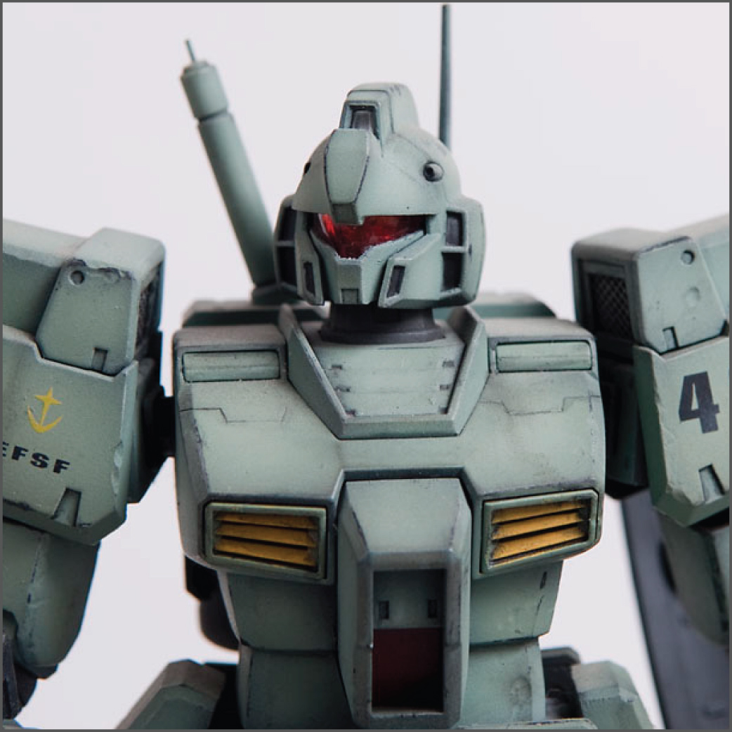 I added a few detail bits to this kit, such as some mesh screens in the shoulders, some back detail on the shield. I also cut the gun apart and redesigned it, as well as the feet since I didn’t like the stock kit’s feet. Painted in anime colors to finish it off.