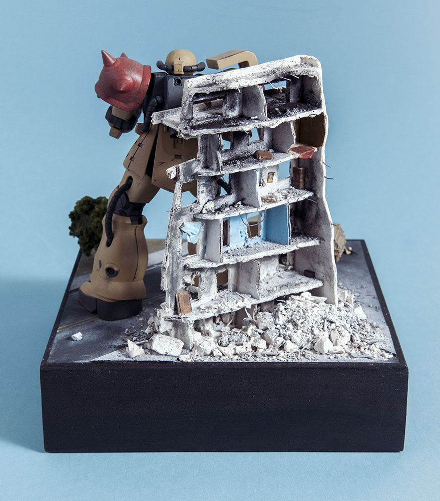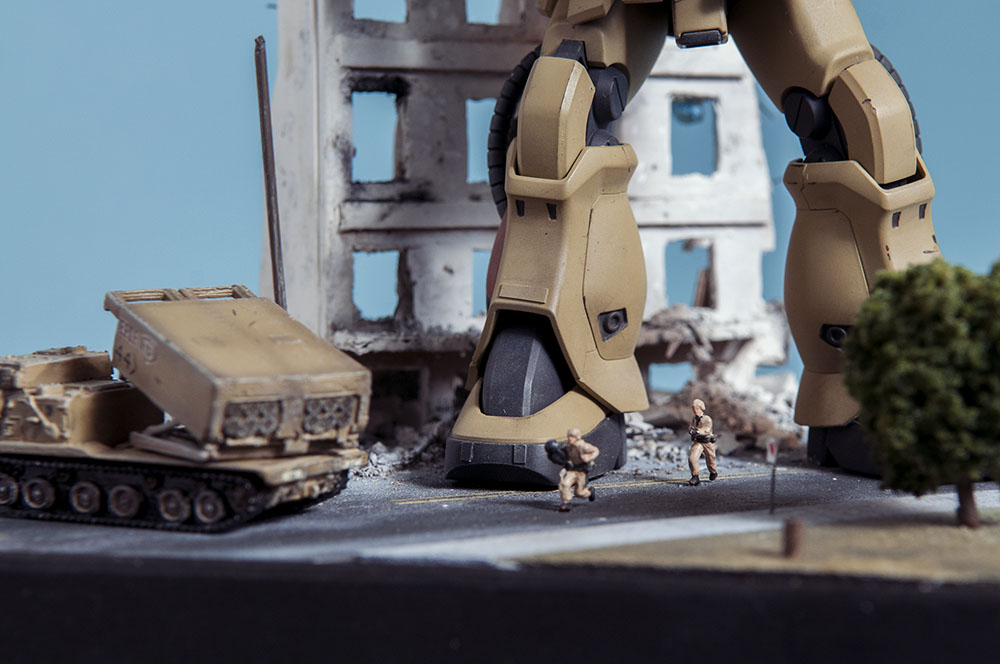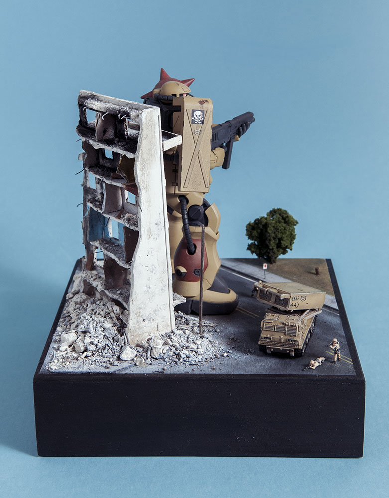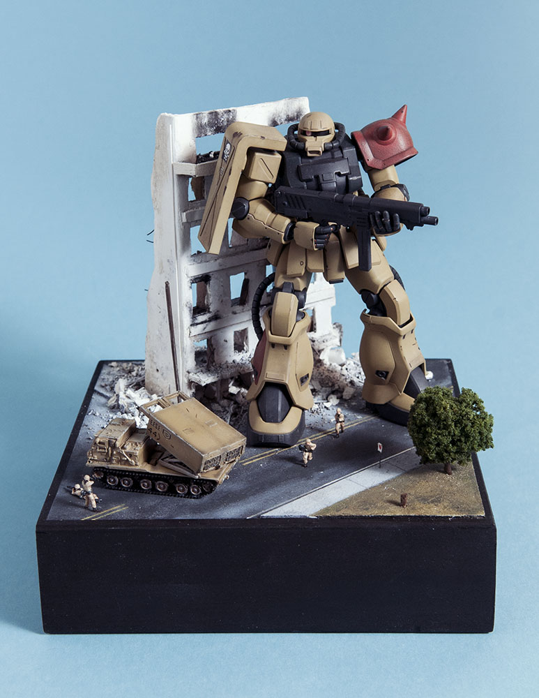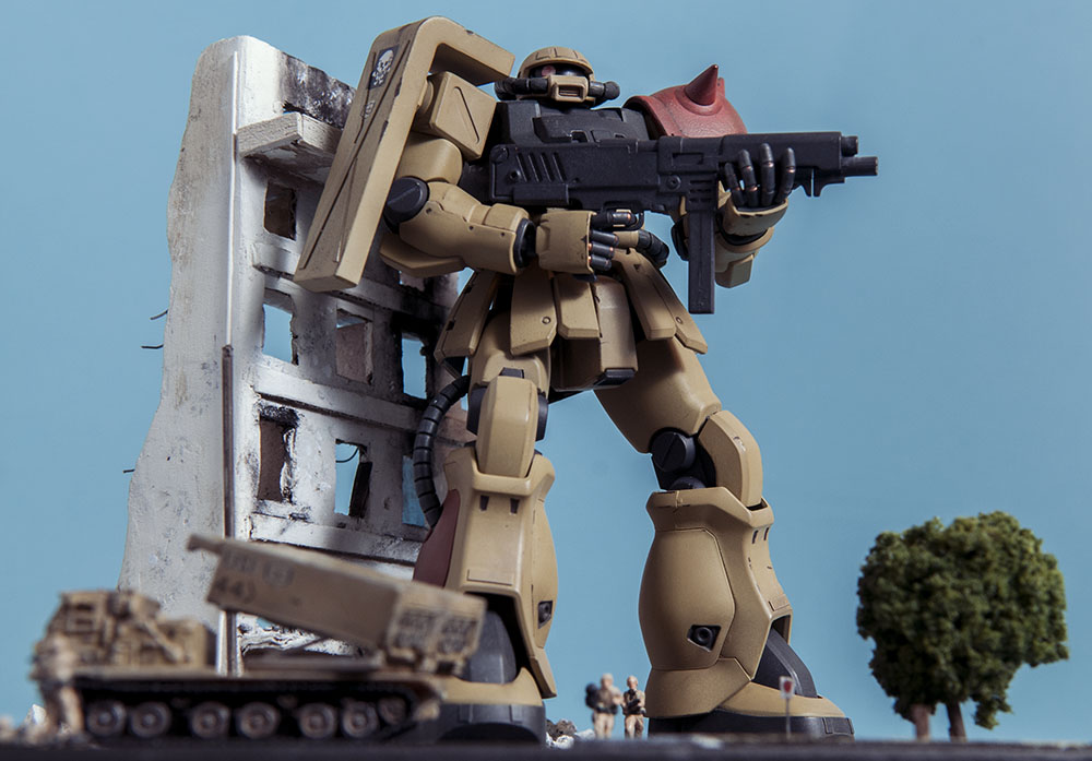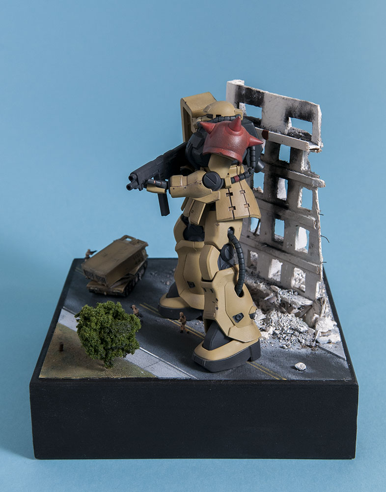 The Zaku F2 has always been my favorite Zaku design. I like the 'chunkiness' of it or something. Maybe it's because 0083 was the first Gundam series I ever saw and it's nostalgia.. dunno. Anyway, this HGUC version is a nice little kit. It's your typical HGUC, but it's a little more modern so it has good details and form. I decided to make a little diorama out of it since it's a small-ish size. I scratch built the building, adding rubble from crushed plaster and dirt from the back patio. The armor is pre-built from Dragon models. It just happens to be 1/144 scale too, so bonus. The figures are from Pegasus models and are also pre-built. In the anime, the Earth Federation is using some stolen Zakus for themselves, so I painted those last two, as well as the Zaku, to fit the Earth Federation forces.