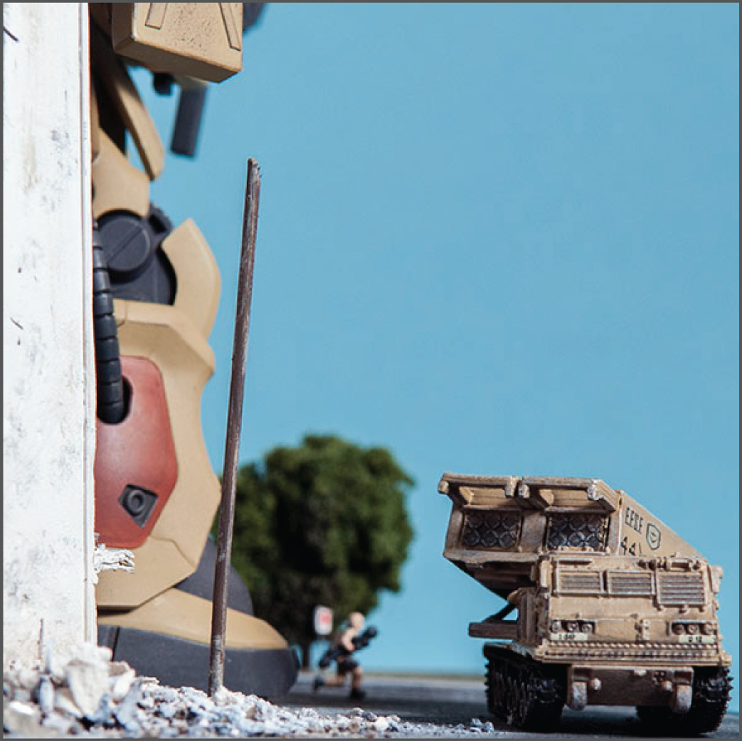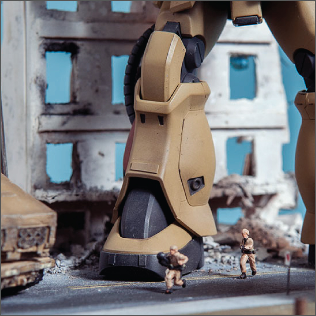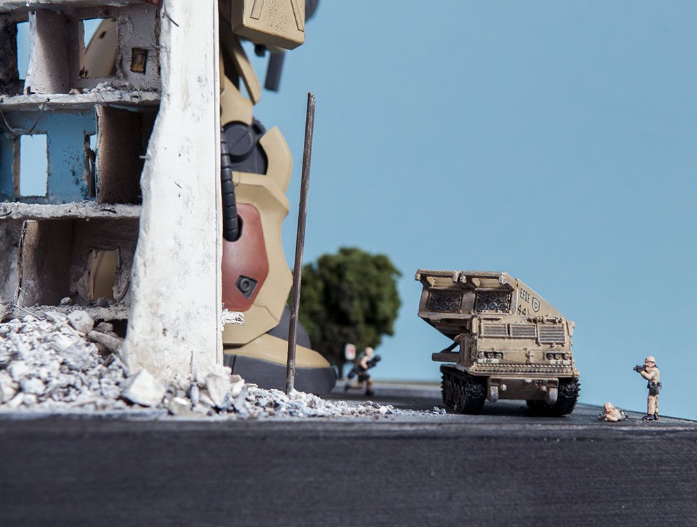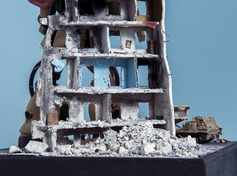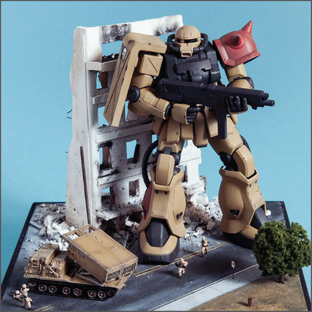The Zaku F2 has always been my favorite Zaku design. I like the 'chunkiness' of it or something. Maybe it's because 0083 was the first Gundam series I ever saw and it's nostalgia.. dunno. Anyway, this HGUC version is a nice little kit. It's your typical HGUC, but it's a little more modern so it has good details and form. I decided to make a little diorama out of it since it's a small-ish size. I scratch built the building, adding rubble from crushed plaster and dirt from the back patio. The armor is pre-built from Dragon models. It just happens to be 1/144 scale too, so bonus. The figures are from Pegasus models and are also pre-built. In the anime, the Earth Federation is using some stolen Zakus for themselves, so I painted those last two, as well as the Zaku, to fit the Earth Federation forces.