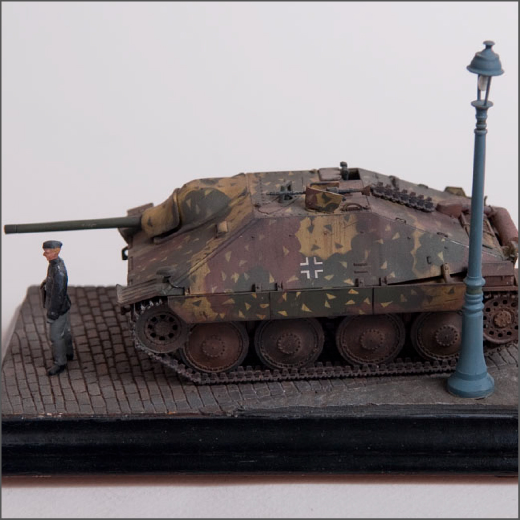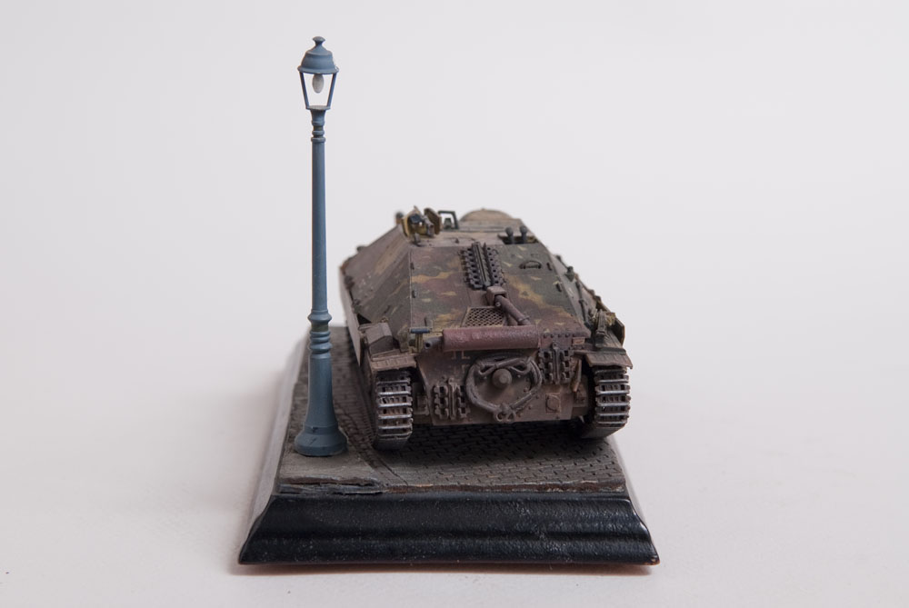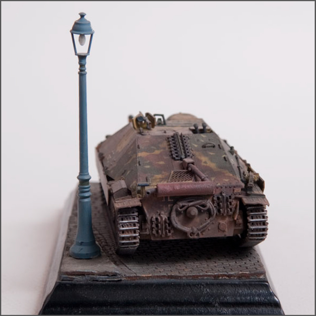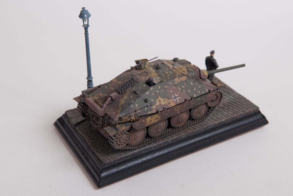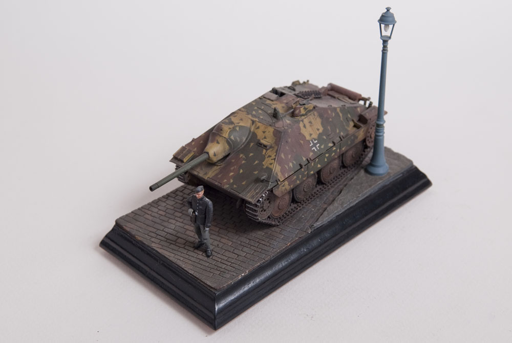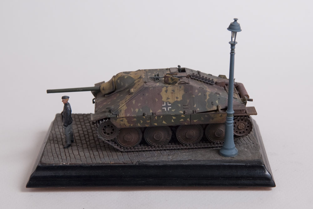 Built straight from the box with only a little photoetch mesh added to the grill. The figure is from a separate Tamiya set as well as the lamp post. The cobblestones are made from plaster.