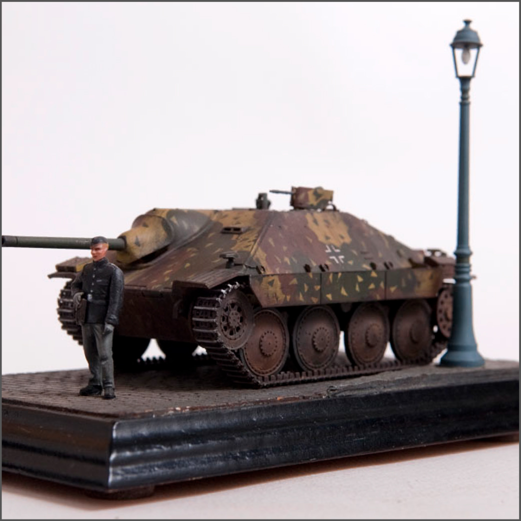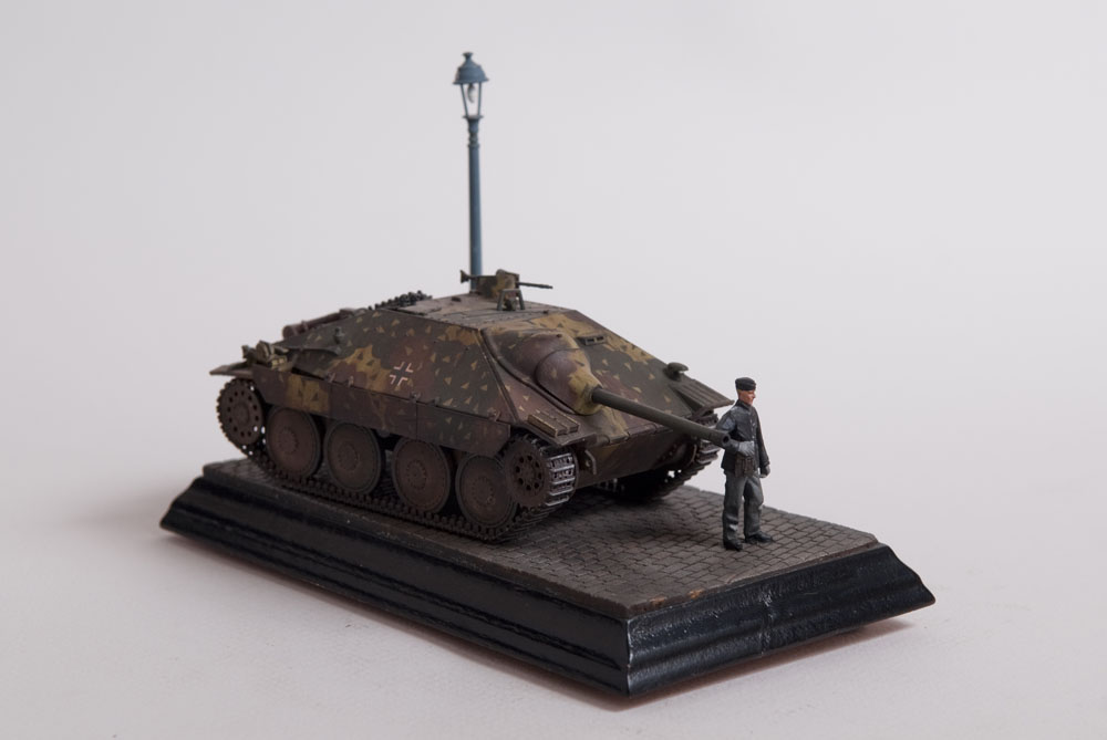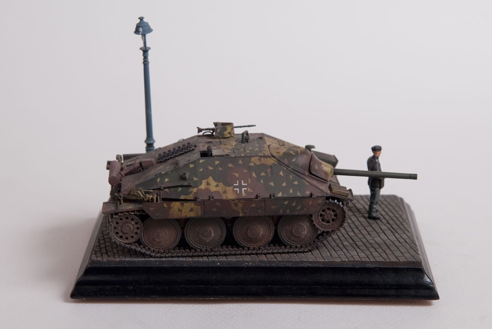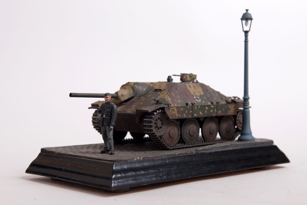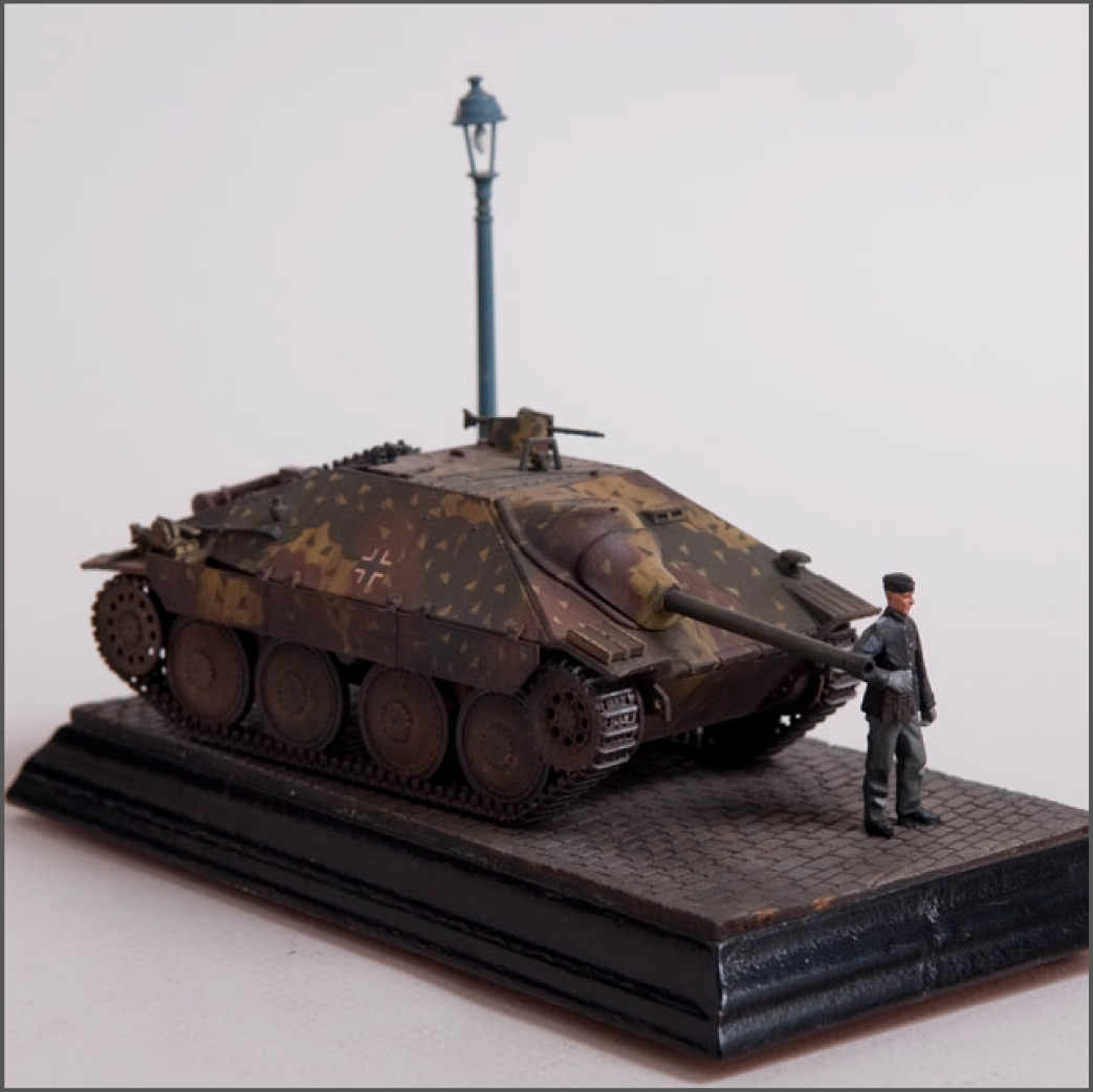 Built straight from the box with only a little photoetch mesh added to the grill. The figure is from a separate Tamiya set as well as the lamp post. The cobblestones are made from plaster.