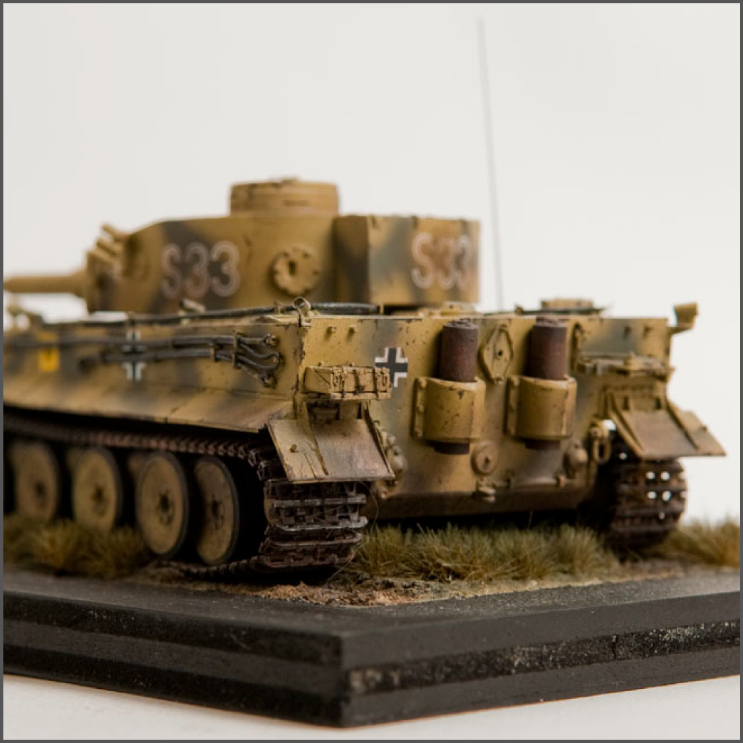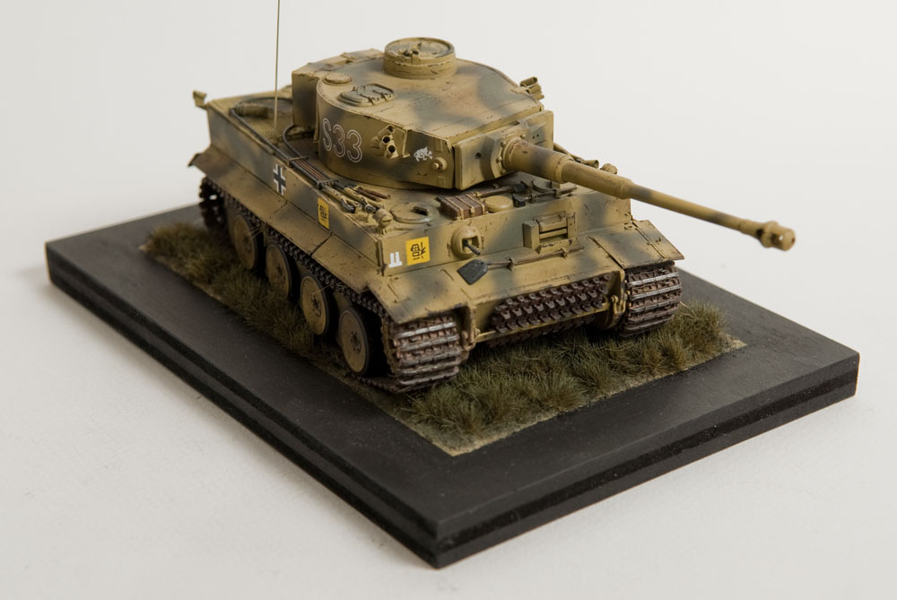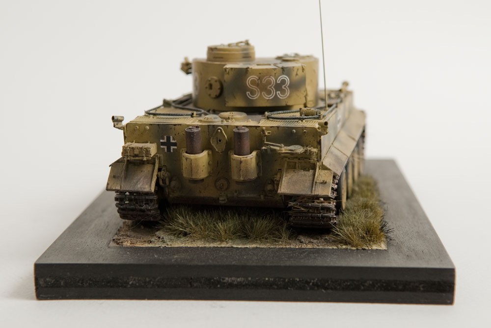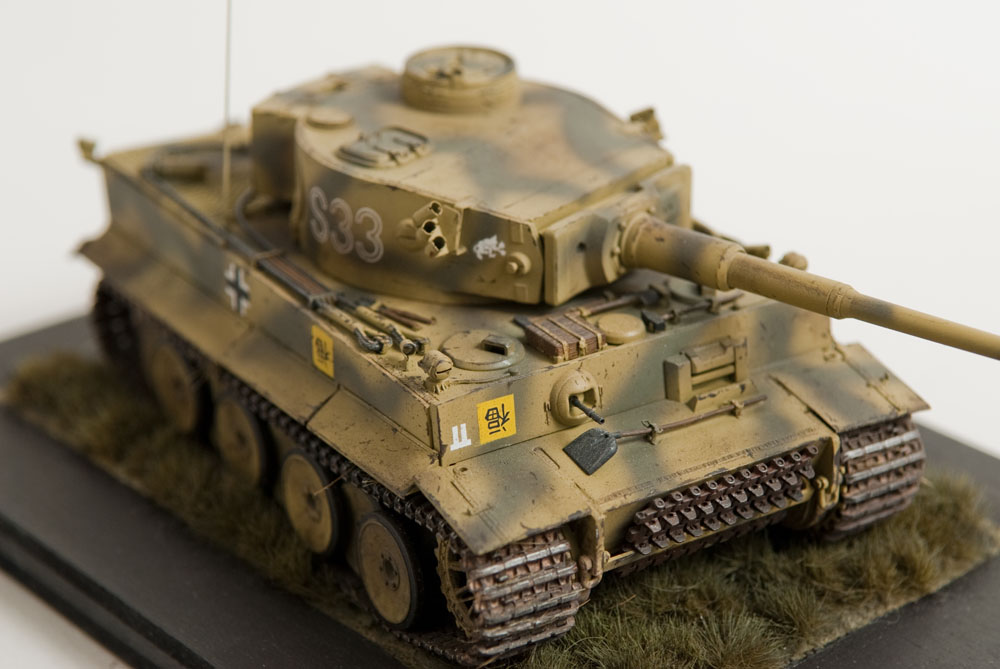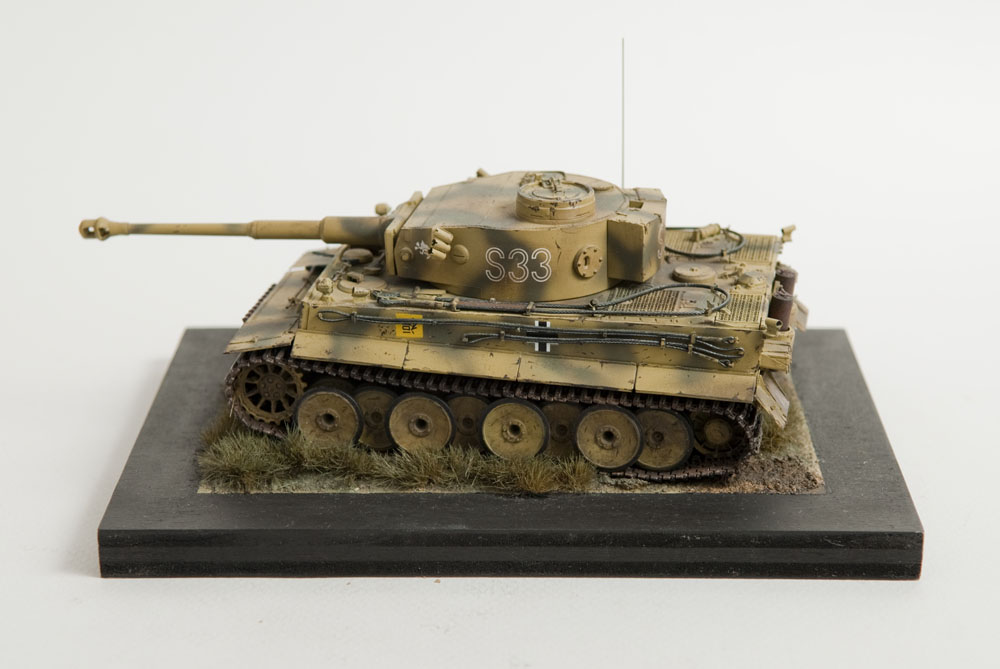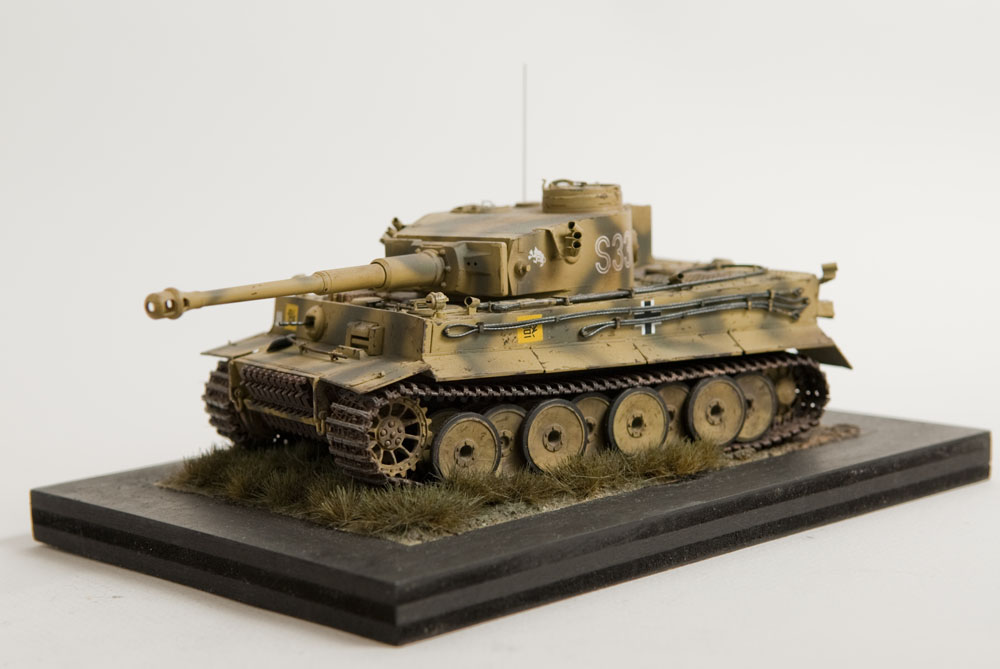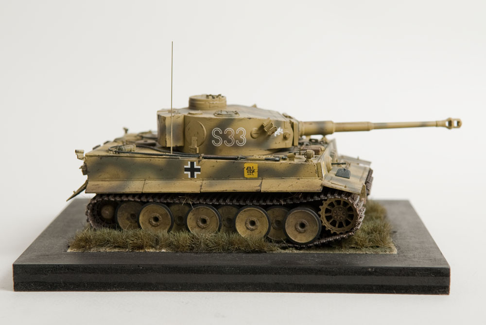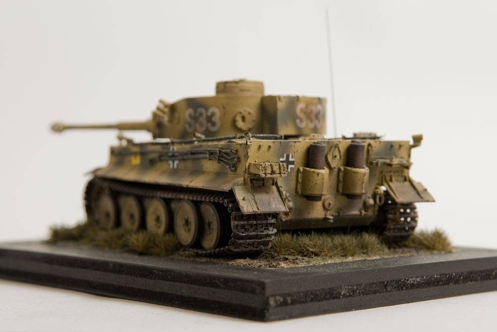 The S33 Tiger is a pretty popular subject. Probably because it's used for the box art, with decals, of many a Tamiya Tiger kit. This one's built with full photoetch details from Eduard. A metal barrel and resin tracks to give them that proper sag. The grass on the base is from "The Army Painter". It's good stuff..