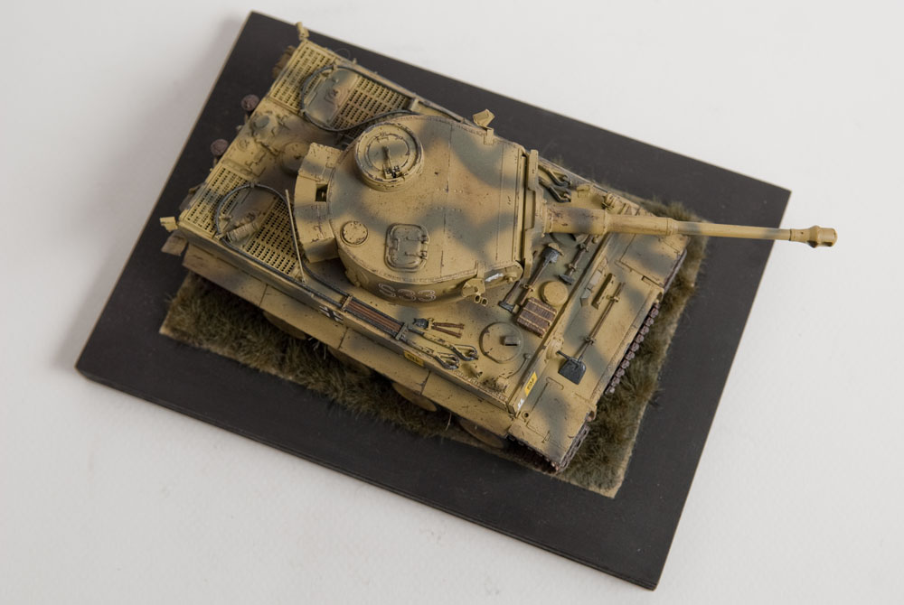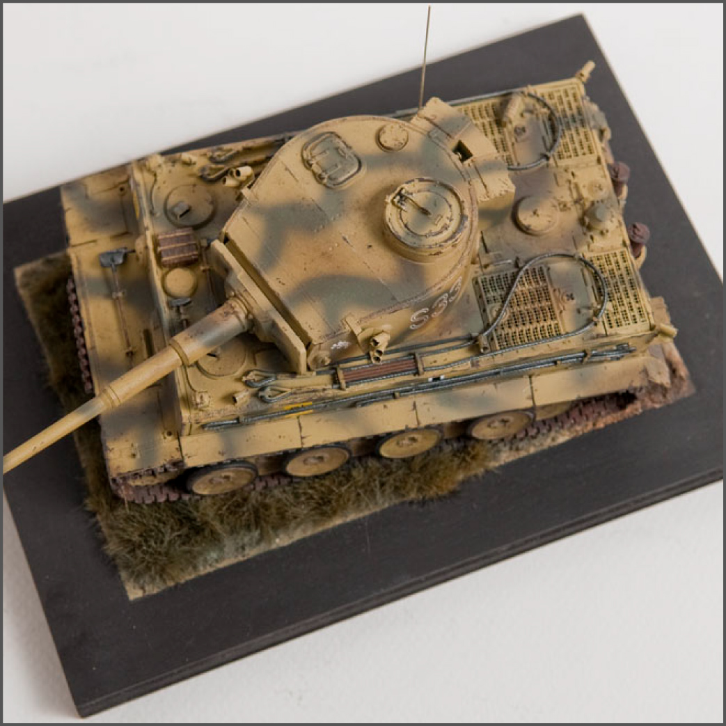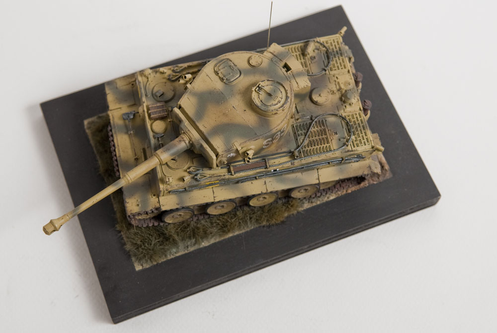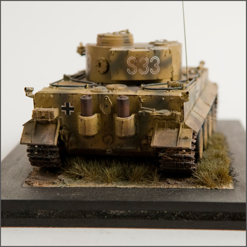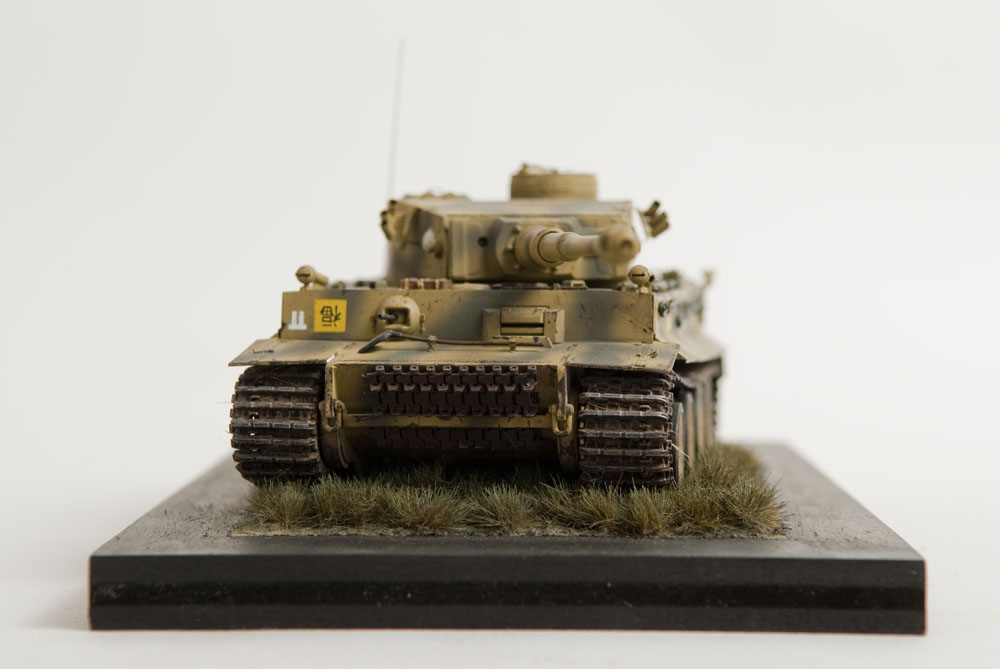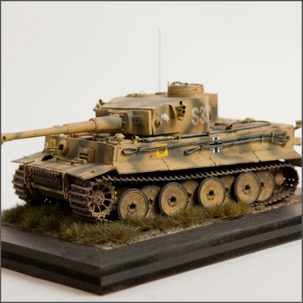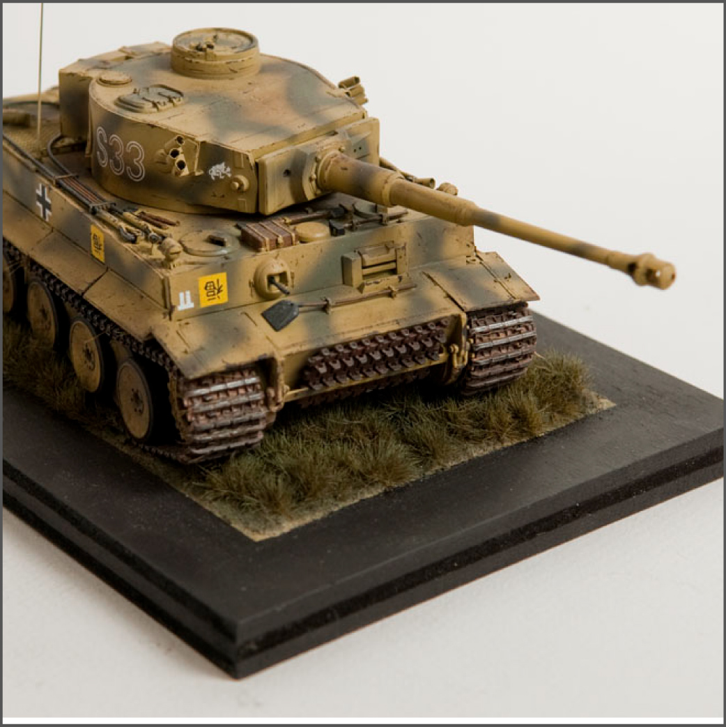 The S33 Tiger is a pretty popular subject. Probably because it's used for the box art, with decals, of many a Tamiya Tiger kit. This one's built with full photoetch details from Eduard. A metal barrel and resin tracks to give them that proper sag. The grass on the base is from "The Army Painter". It's good stuff..