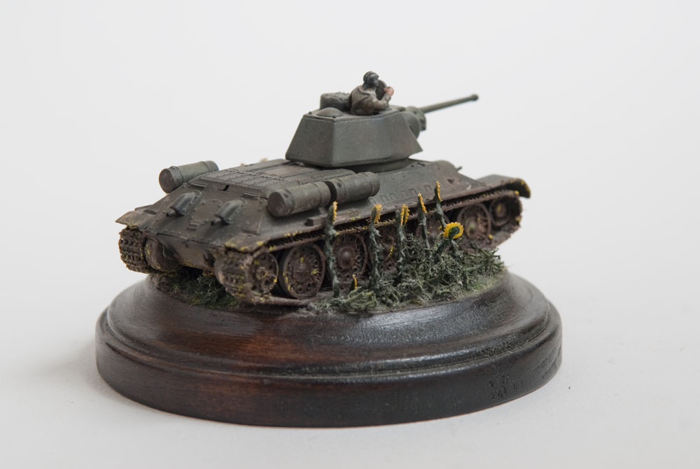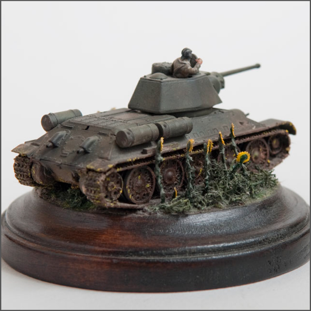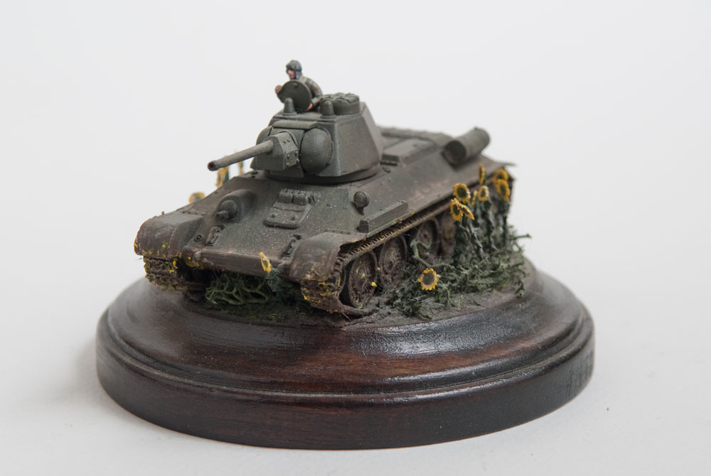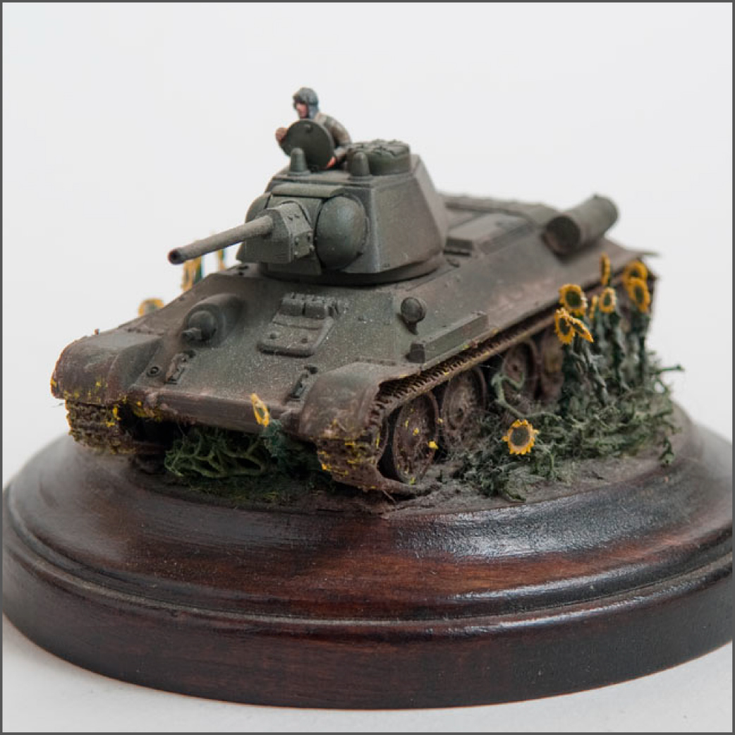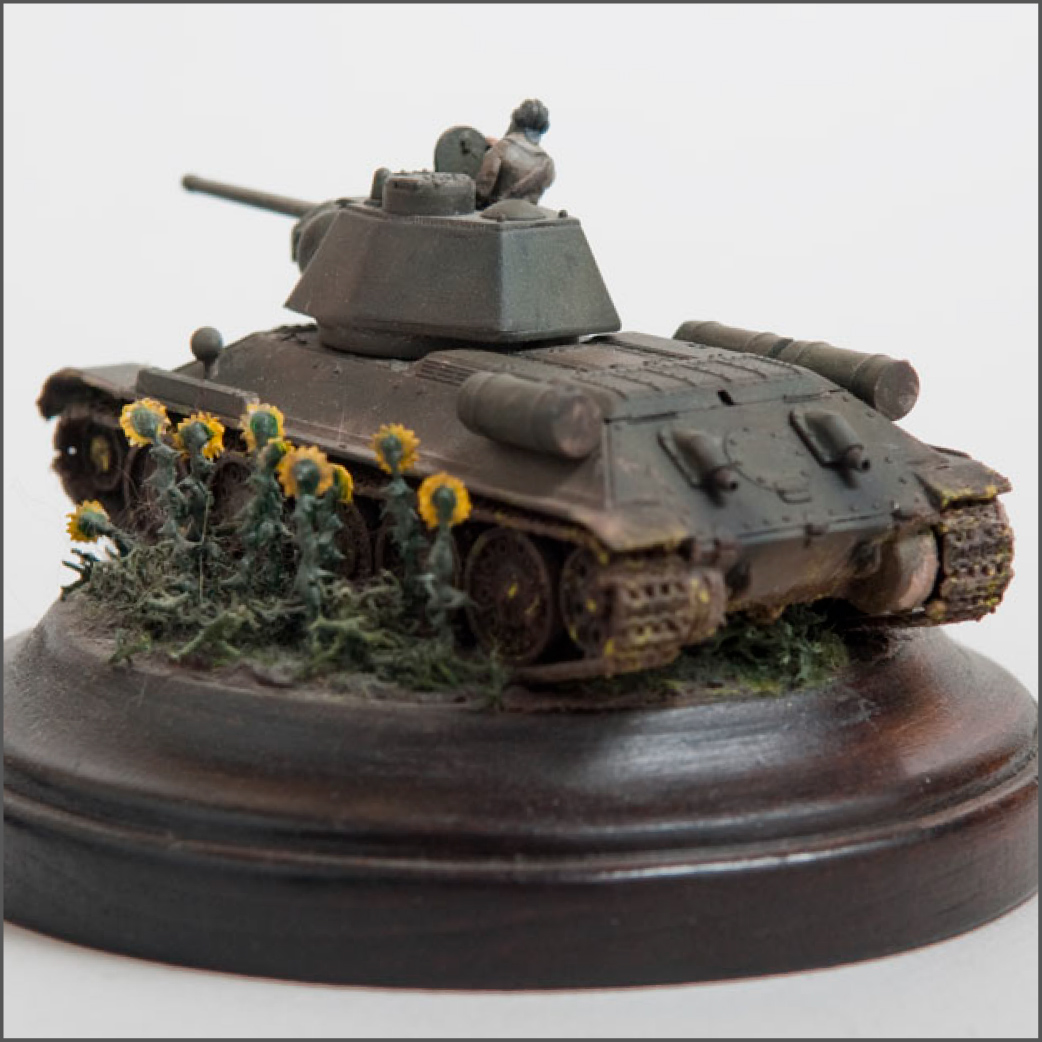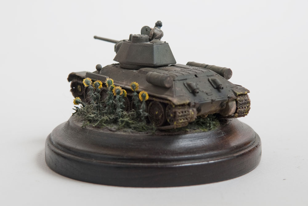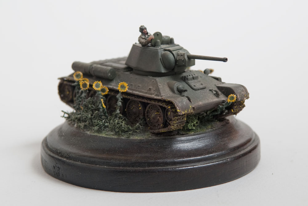 I built this after reading the book, Last Citadel, which more or less is about some tankers during the battle of Kursk in Russia during WWII. Part of the book describes a battle taking place in a field of sunflowers. This is a tiny 1/72 kit, built oob. The sunflowers are wire and cut paper.