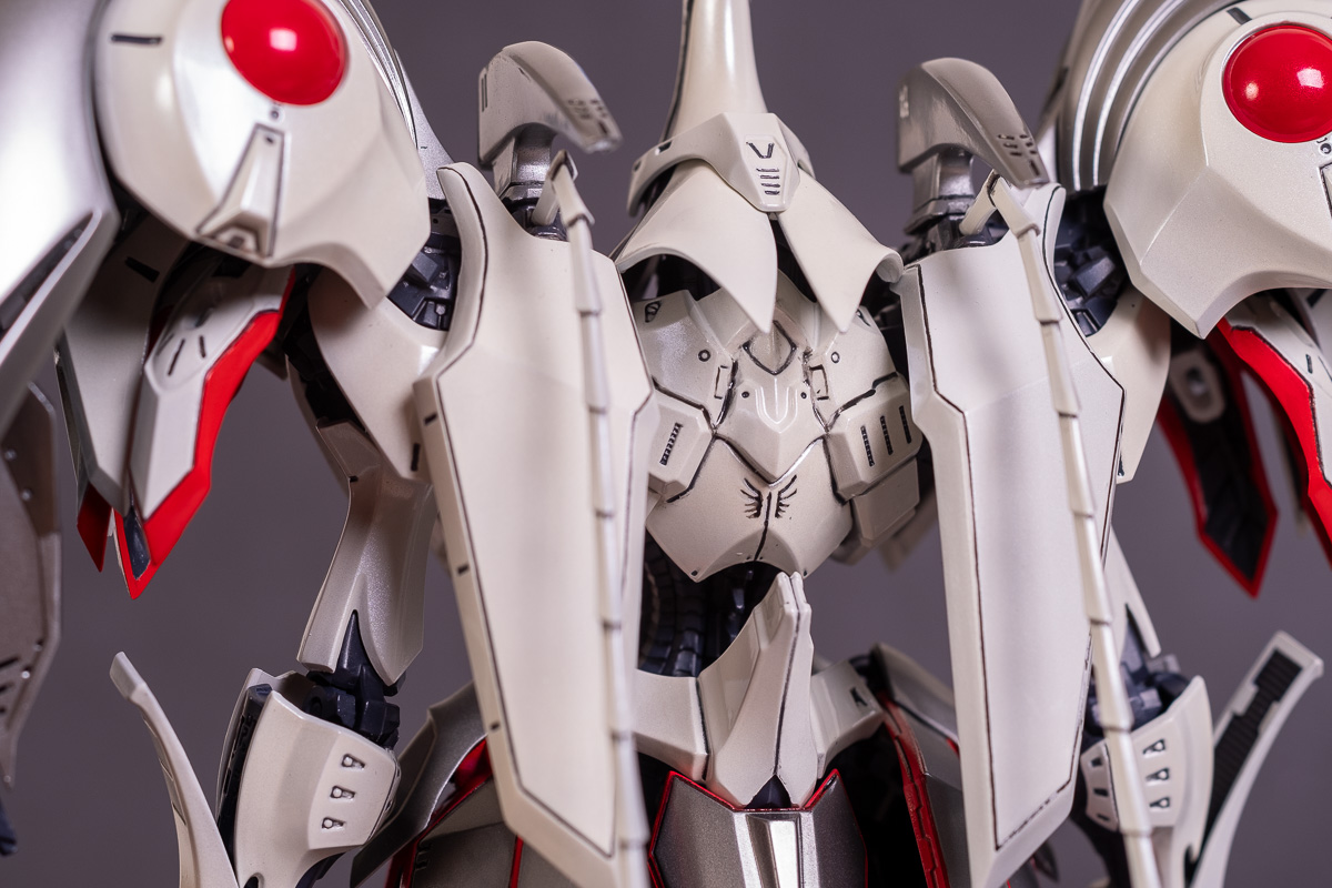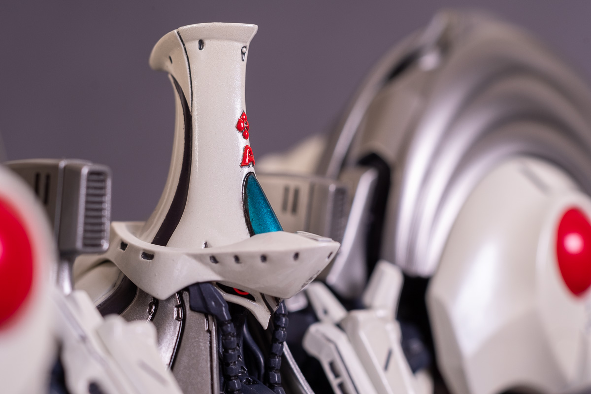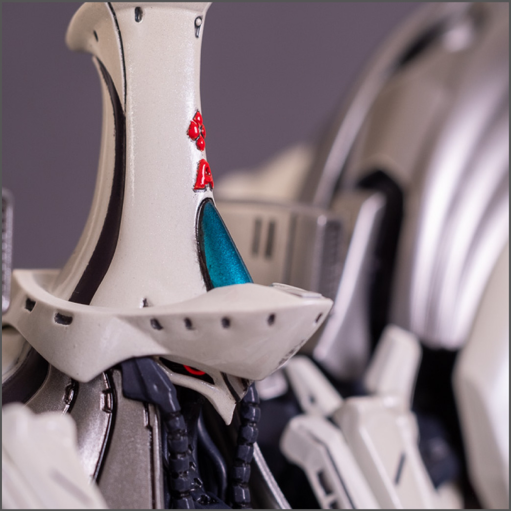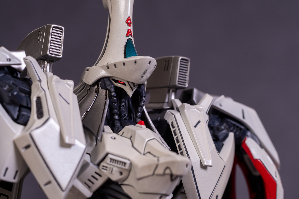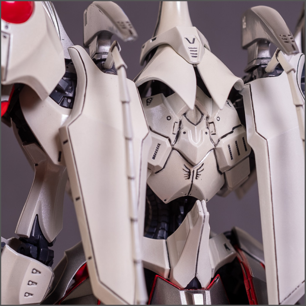Painted with Mr Color paints mostly with the usual Vallejo for some detail bits and Gaia EX Gloss Clear for the final coating. I used a white pearl over the base color and that was causing a lot of issues. The paint would separate and crack on its own for no reason that I could figure out. One part had to be re-painted 8 times...yes, 8... because I'm an ocd perfectionist with these things.. *to a point anyway..but eventually it worked out.. after switching to a different brand..lol.