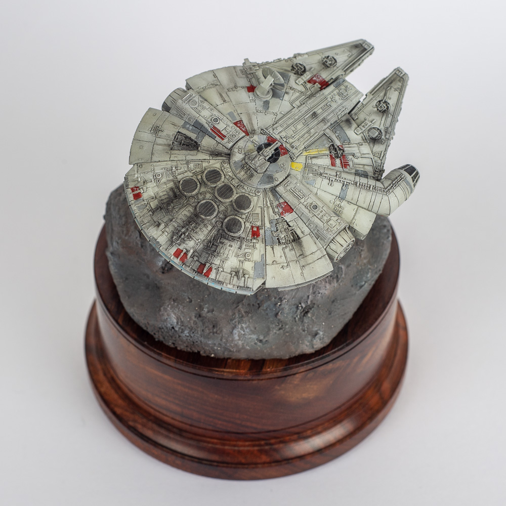 One of, if not THE most famous spaceships in history. The Millinnium Falcon. The piece of junk that made the Kessel Run in less than 12 parsecs. Han Solo's baby. It's a beauty. I have a couple kits of it, but this is the smallest one. You wouldn't know it from the photos, but it fits in the palm of your hand. Bandai's molding has gotten this good. The detail at this scale is astonishing. |