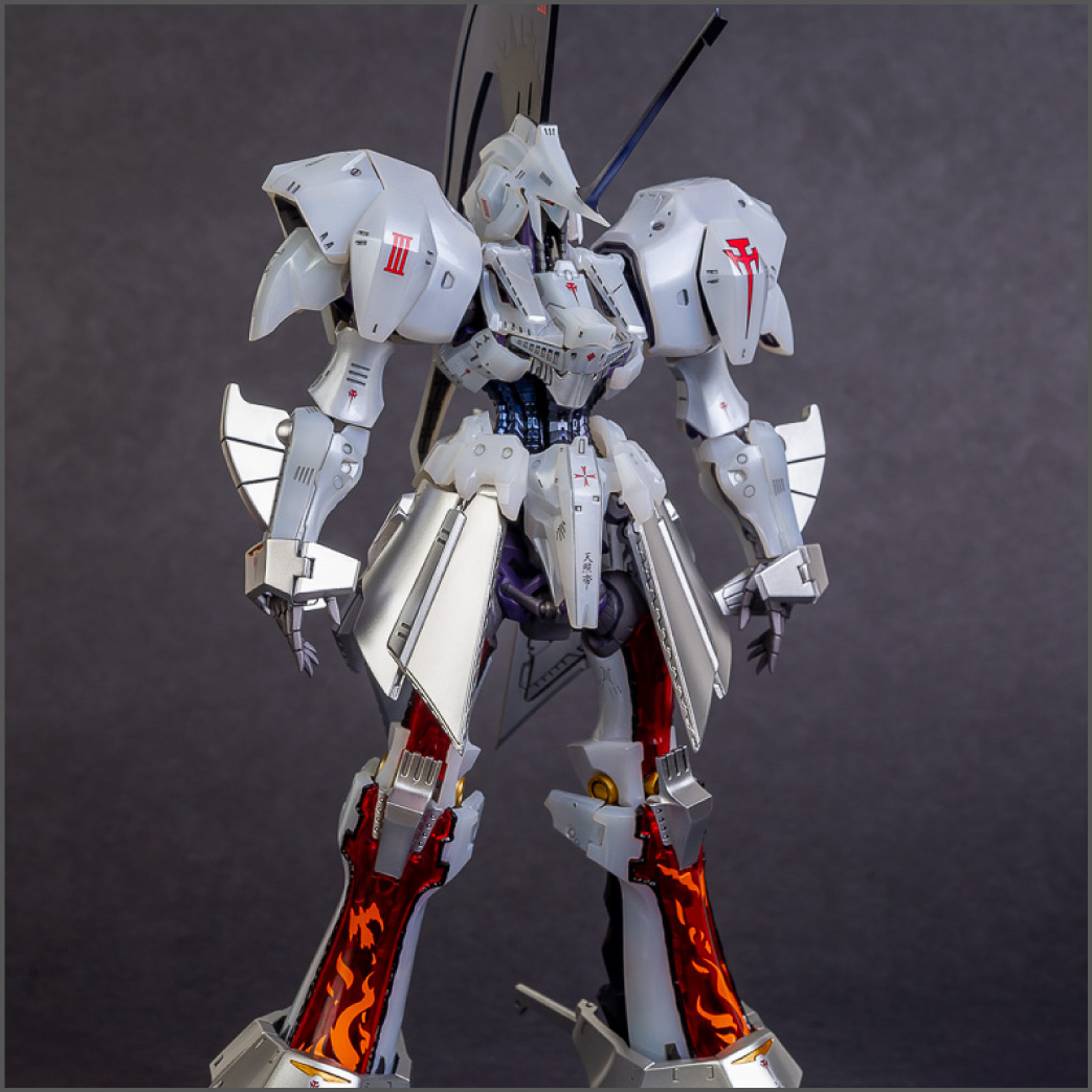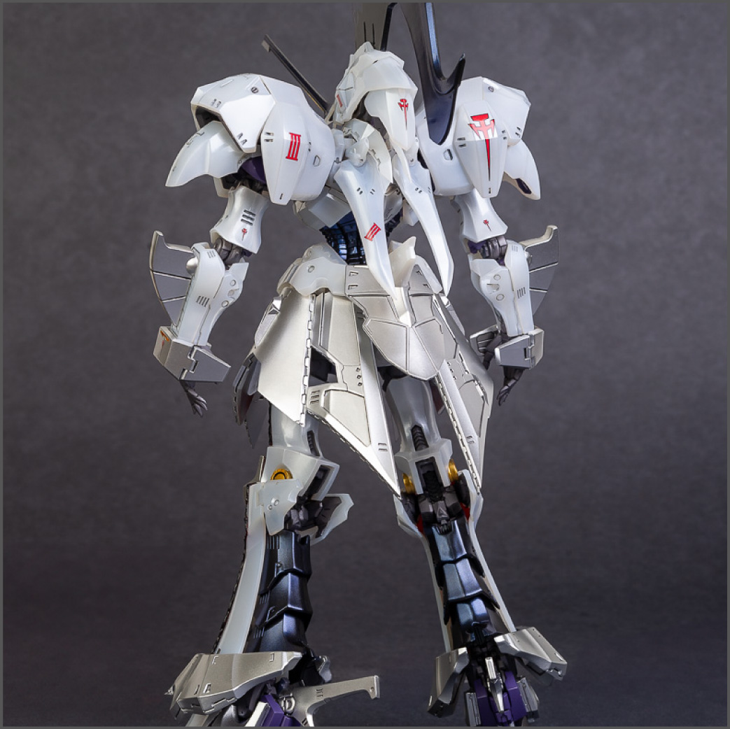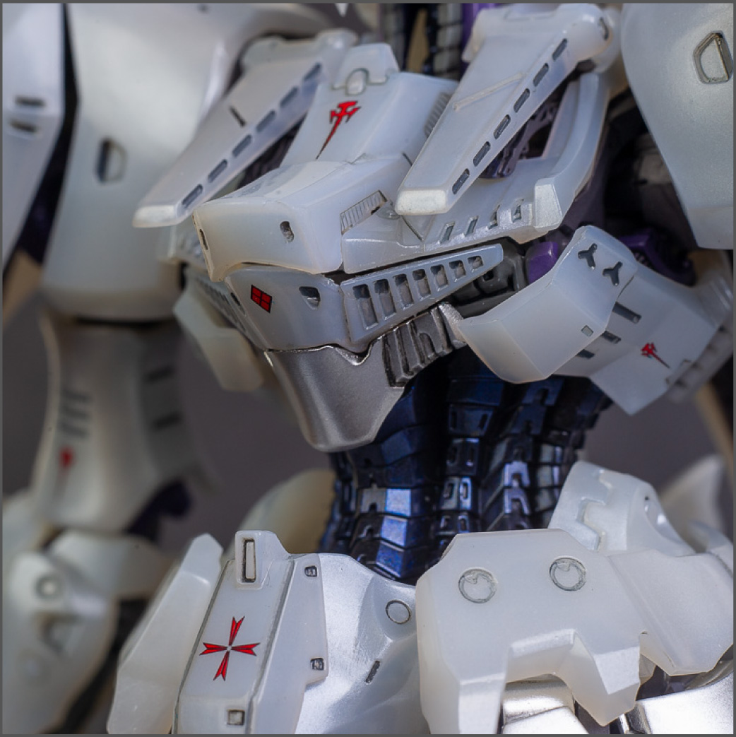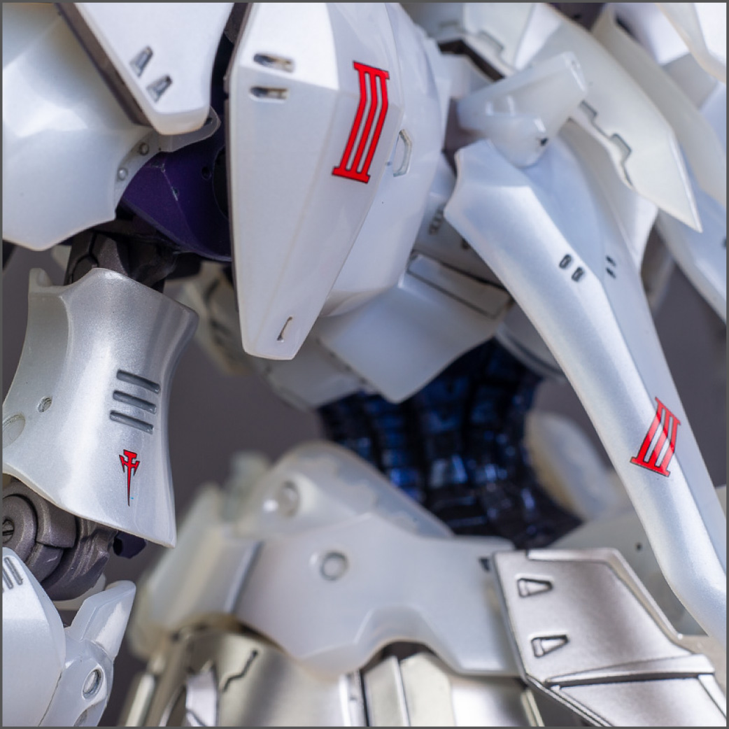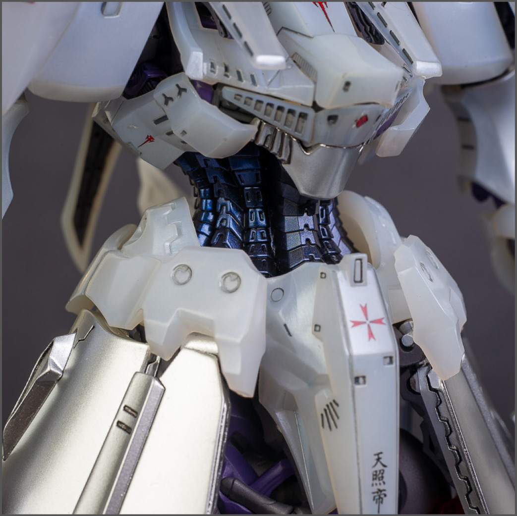 The main painting was as follows: White armor: Mr Color Lascivus Clear White, with Mr Crystal Color Moonstone Pearl on top. Blue/Black waist and "mohawk": Gloss black with Mr Crystal Color Sapphire Blue over it. The frame is just straight up Mr Color Purple and the grey is a mix of some stuff.. it's in the manual, but I forgot what it was. Silver: Tamiya lacquer Sparkling Silver Gold: Gaianotes Star Bright Gold and... some detail bits with Vallejo I took pics of the frame too, so check them out. They're permanently covered with the armor now, so stuff like the Fatima cockpit in the head are sealed forever, but at least I have the photos.