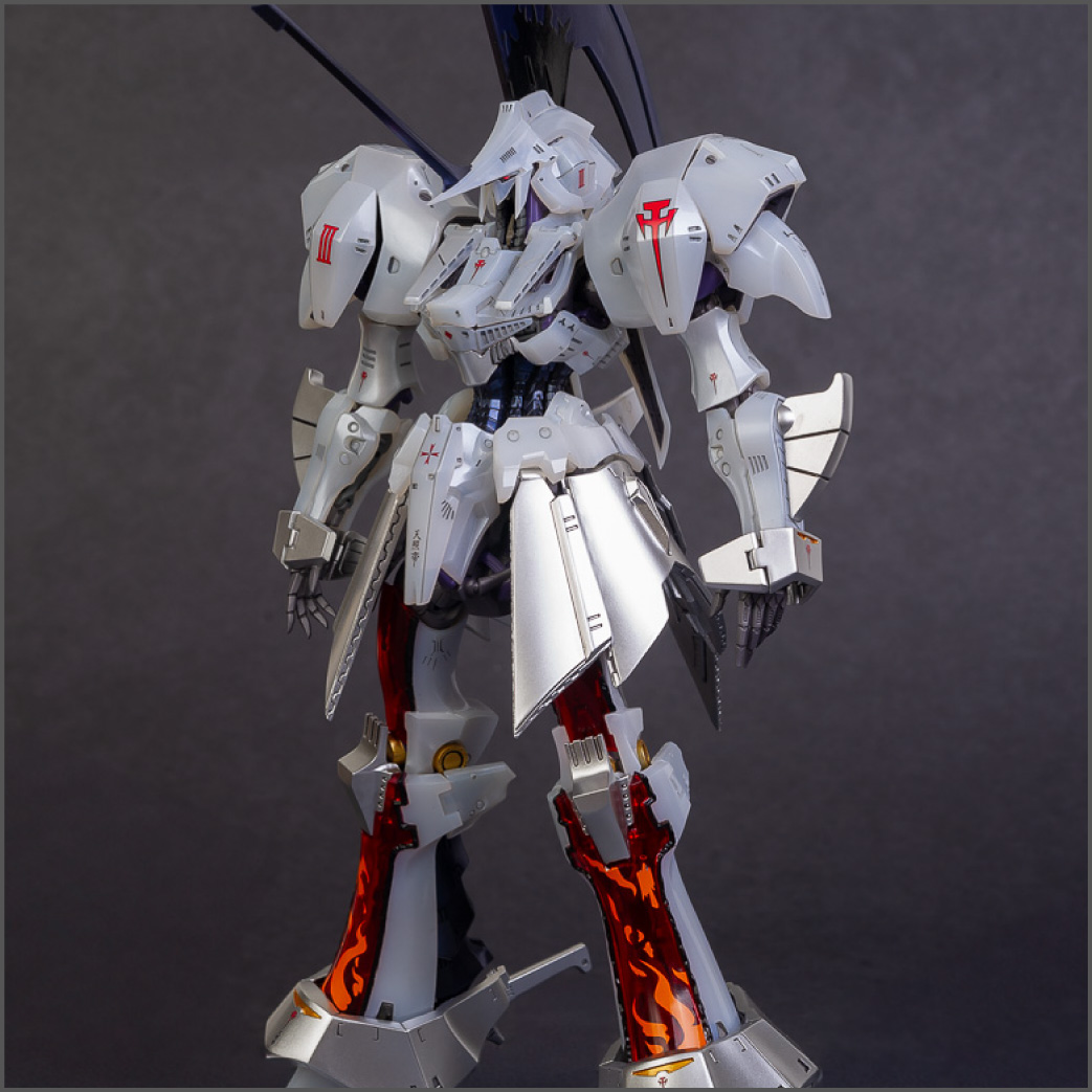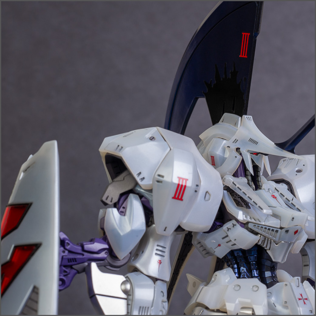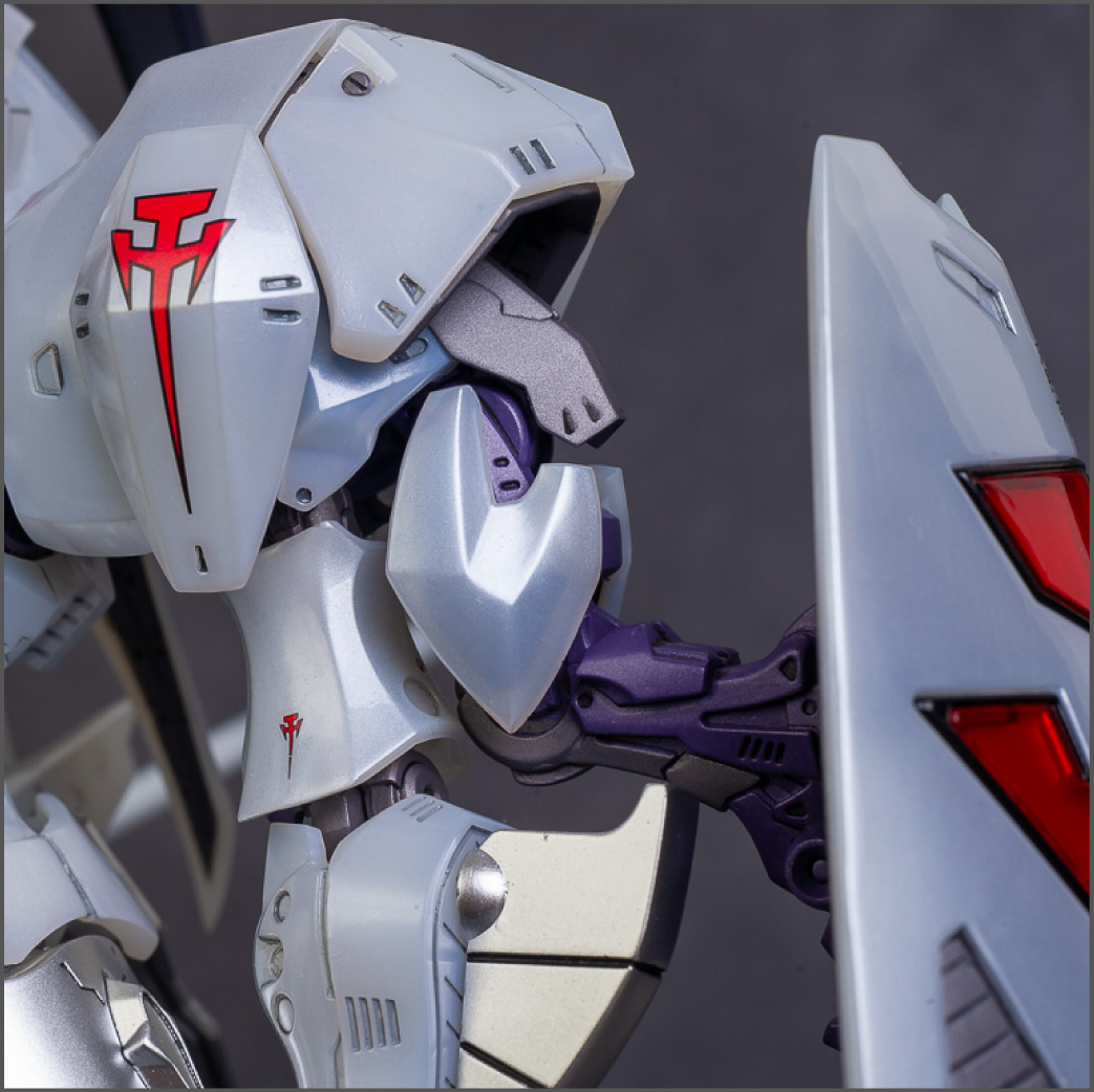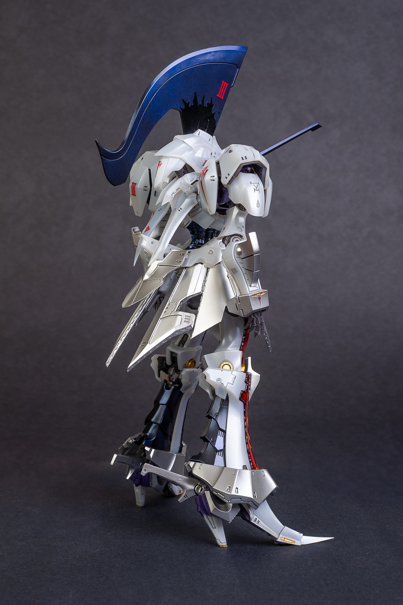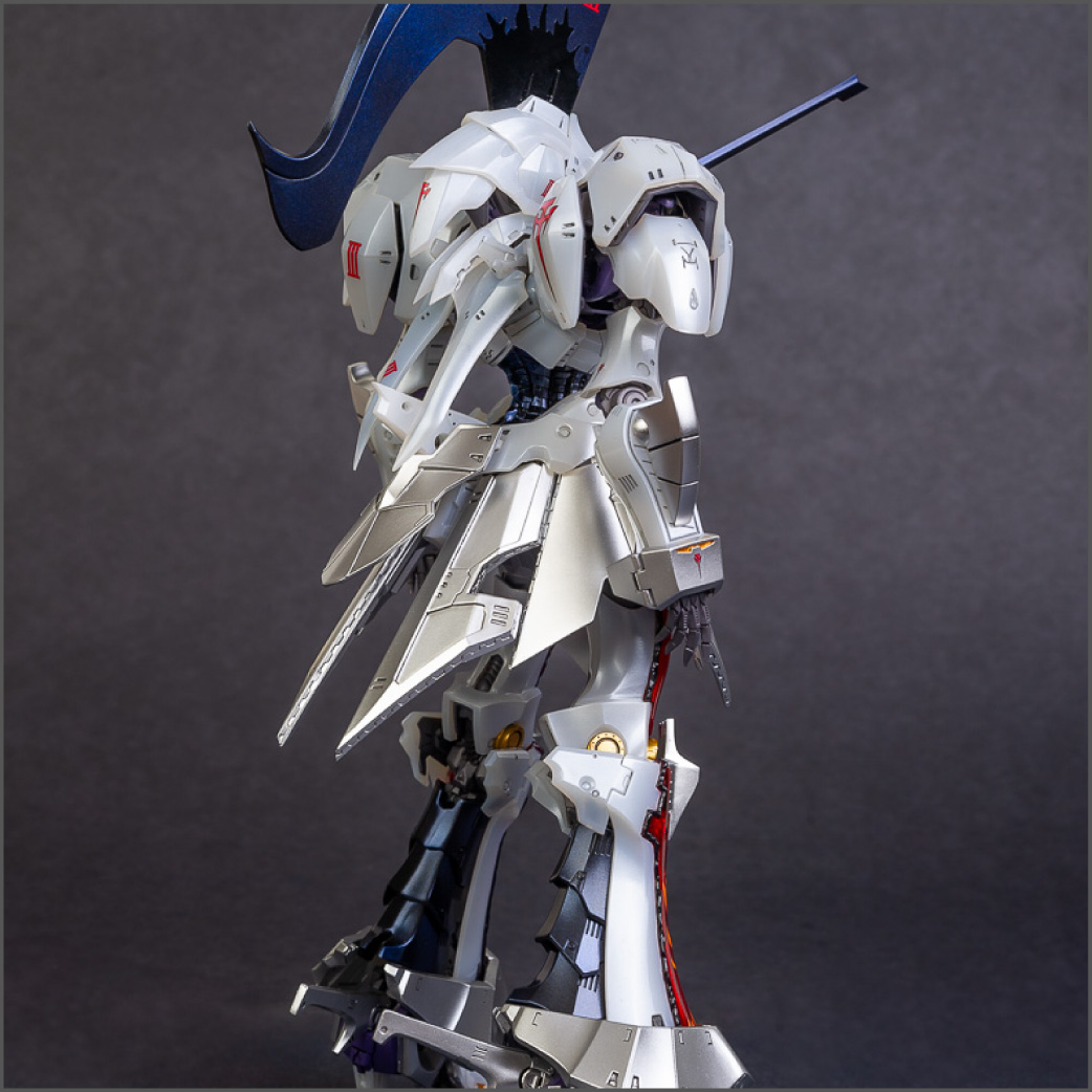 The main painting was as follows: White armor: Mr Color Lascivus Clear White, with Mr Crystal Color Moonstone Pearl on top. Blue/Black waist and "mohawk": Gloss black with Mr Crystal Color Sapphire Blue over it. The frame is just straight up Mr Color Purple and the grey is a mix of some stuff.. it's in the manual, but I forgot what it was. Silver: Tamiya lacquer Sparkling Silver Gold: Gaianotes Star Bright Gold and... some detail bits with Vallejo I took pics of the frame too, so check them out. They're permanently covered with the armor now, so stuff like the Fatima cockpit in the head are sealed forever, but at least I have the photos.