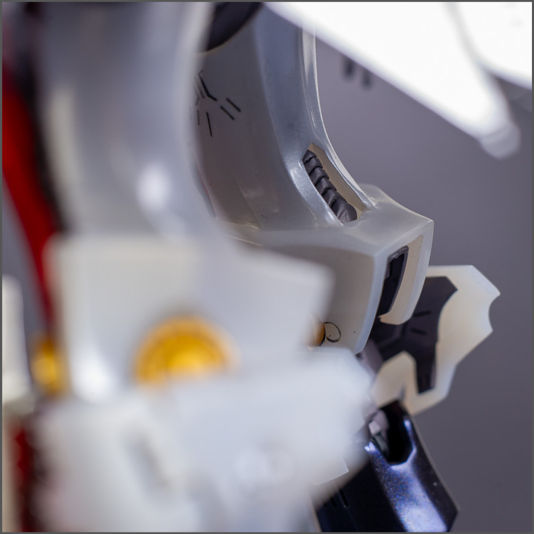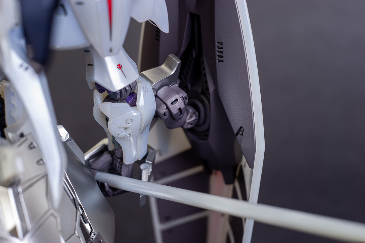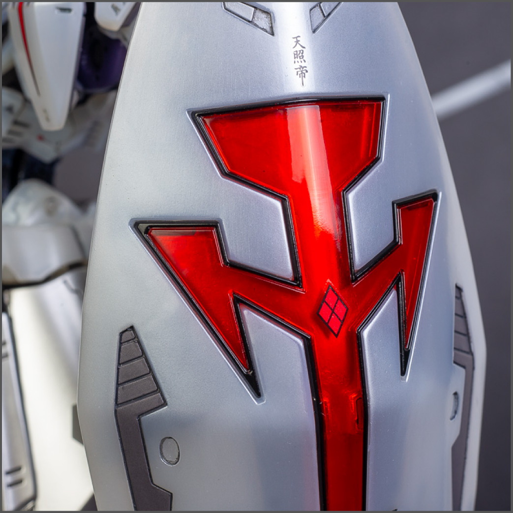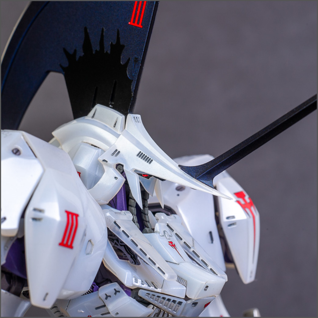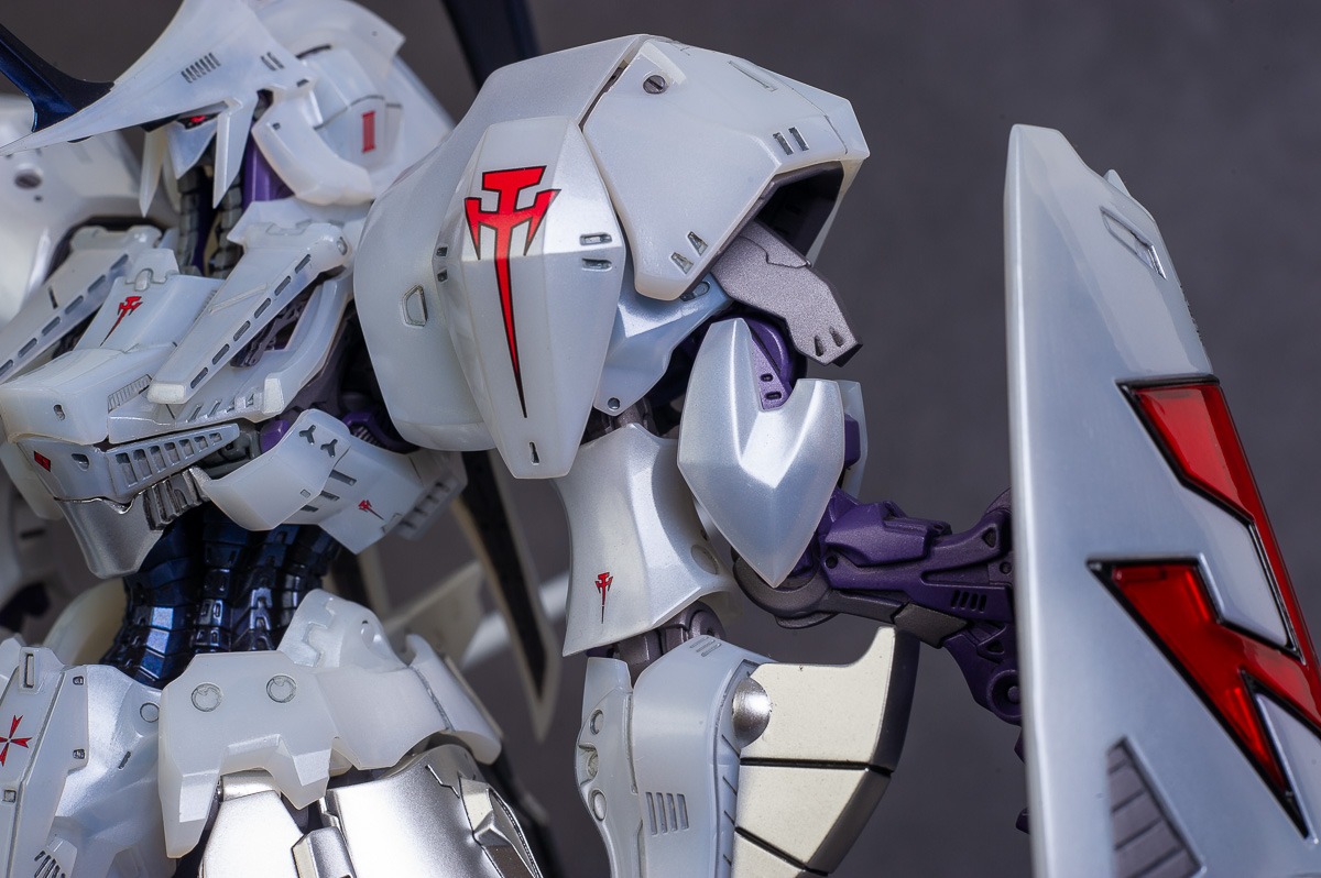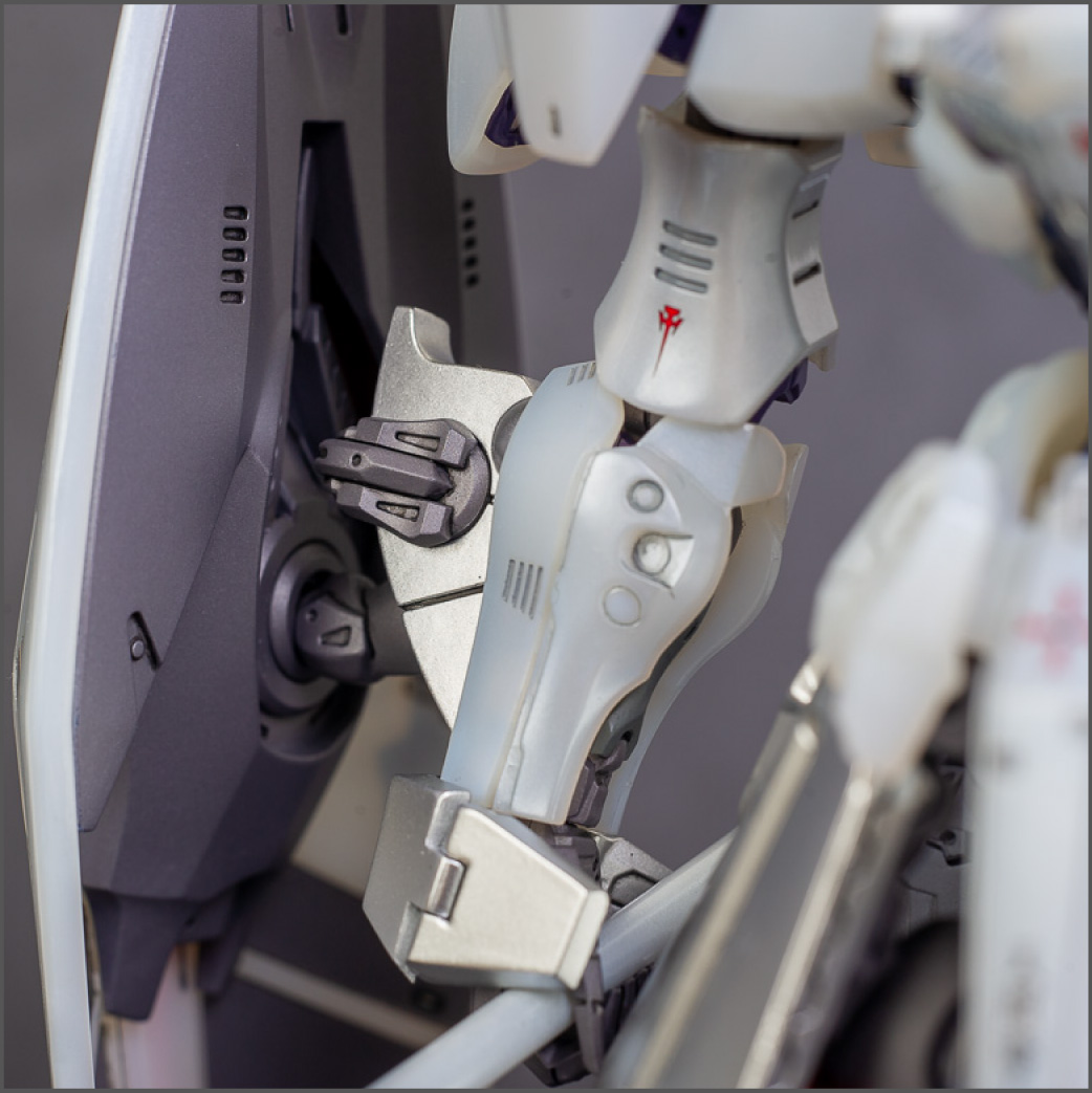 The main painting was as follows: White armor: Mr Color Lascivus Clear White, with Mr Crystal Color Moonstone Pearl on top. Blue/Black waist and "mohawk": Gloss black with Mr Crystal Color Sapphire Blue over it. The frame is just straight up Mr Color Purple and the grey is a mix of some stuff.. it's in the manual, but I forgot what it was. Silver: Tamiya lacquer Sparkling Silver Gold: Gaianotes Star Bright Gold and... some detail bits with Vallejo I took pics of the frame too, so check them out. They're permanently covered with the armor now, so stuff like the Fatima cockpit in the head are sealed forever, but at least I have the photos.