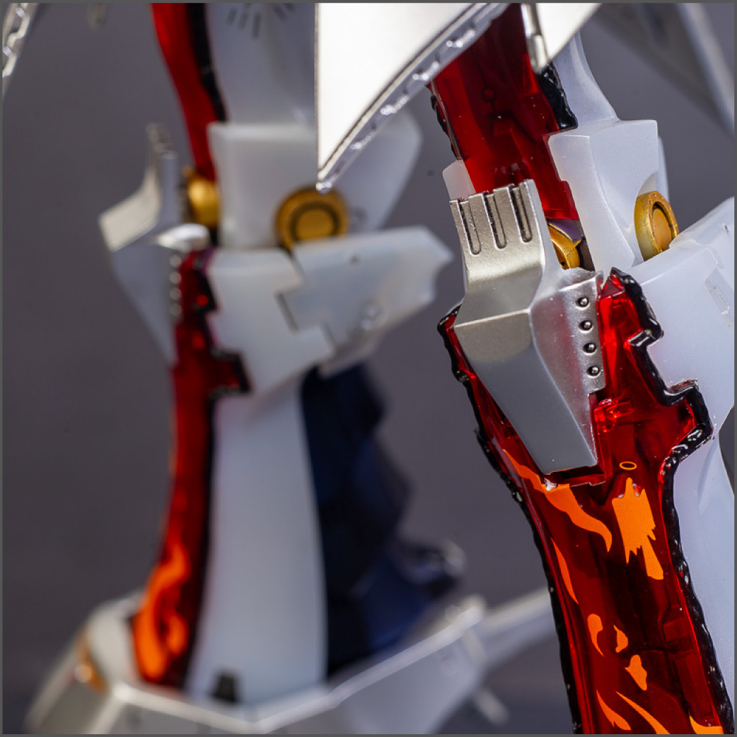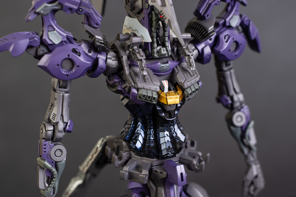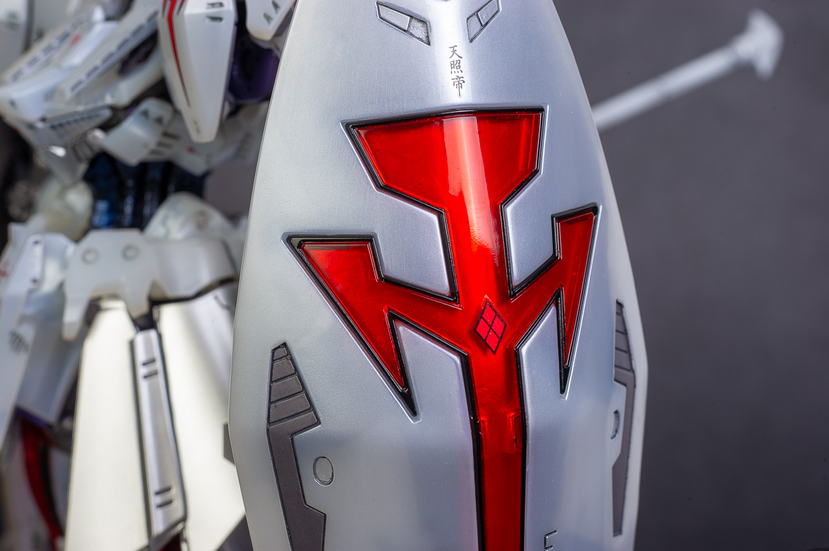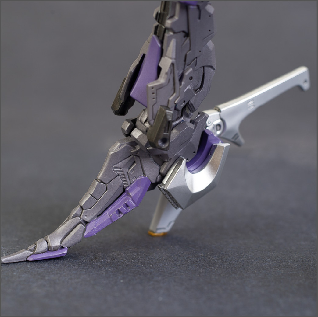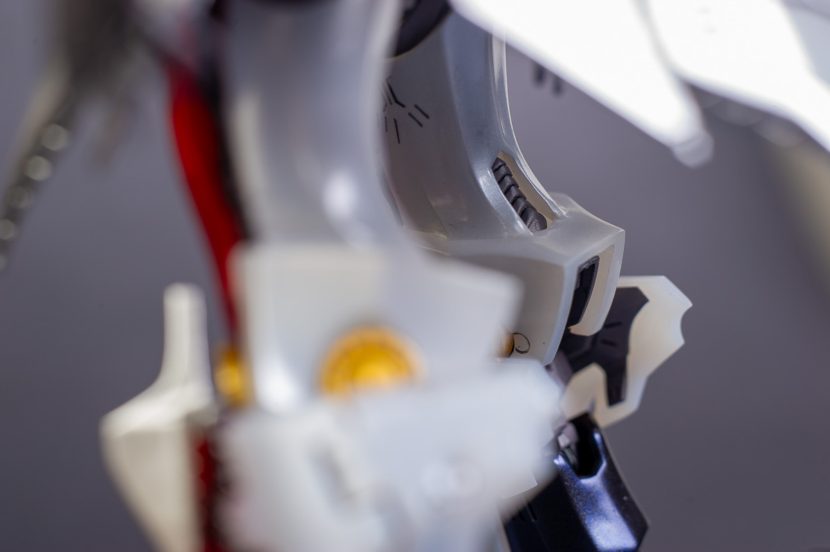 The main painting was as follows: White armor: Mr Color Lascivus Clear White, with Mr Crystal Color Moonstone Pearl on top. Blue/Black waist and "mohawk": Gloss black with Mr Crystal Color Sapphire Blue over it. The frame is just straight up Mr Color Purple and the grey is a mix of some stuff.. it's in the manual, but I forgot what it was. Silver: Tamiya lacquer Sparkling Silver Gold: Gaianotes Star Bright Gold and... some detail bits with Vallejo I took pics of the frame too, so check them out. They're permanently covered with the armor now, so stuff like the Fatima cockpit in the head are sealed forever, but at least I have the photos.